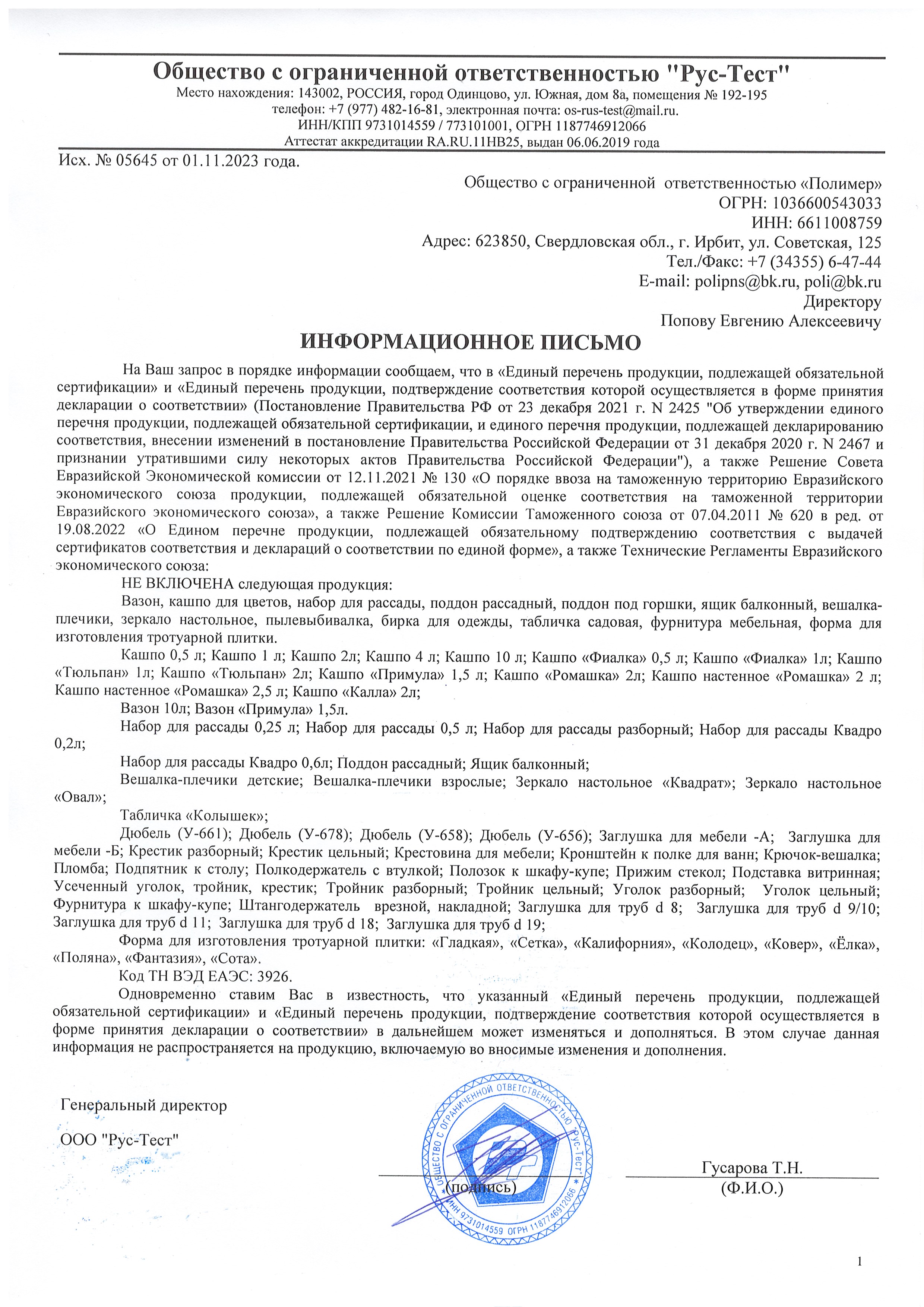 Сертификация-информационное письмо №05645 от 01.11.23 выдано ОС продукции ООО "Рус-Тест"