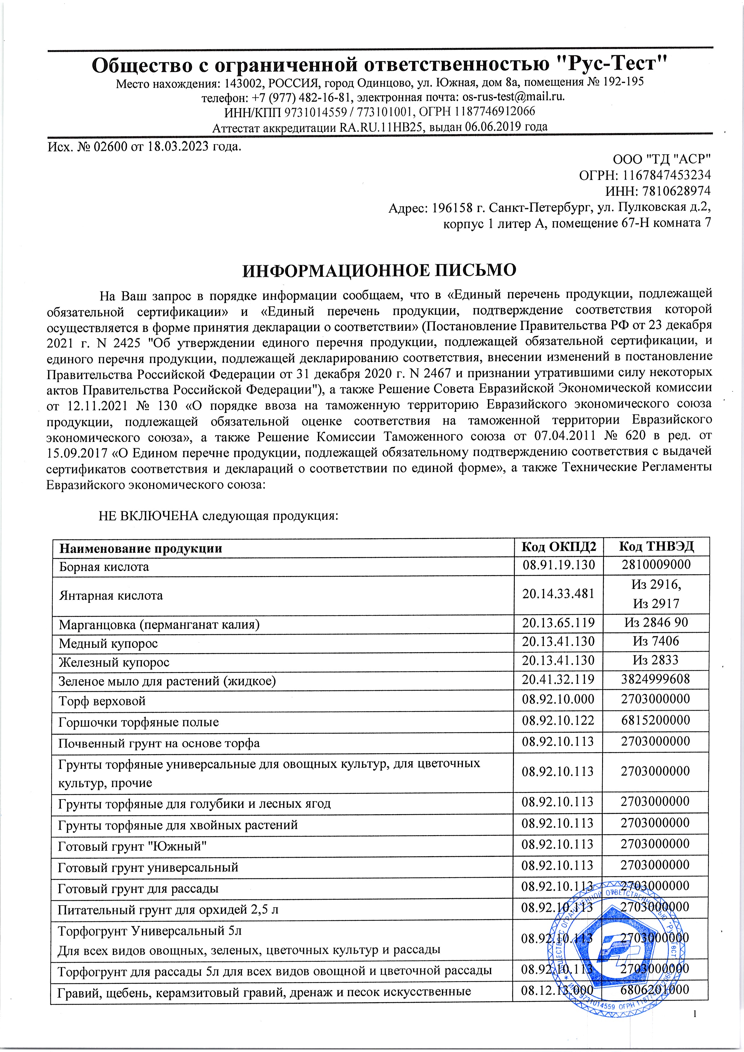 Государственная регистрация - №513-14-2025-1 от 25.10.18 до 24.10.28 выдана МСХ РФ, Сертификация-информационное письмо №02600 от 18.03.23 выдана ОС продукции ООО "Рус-Тест"