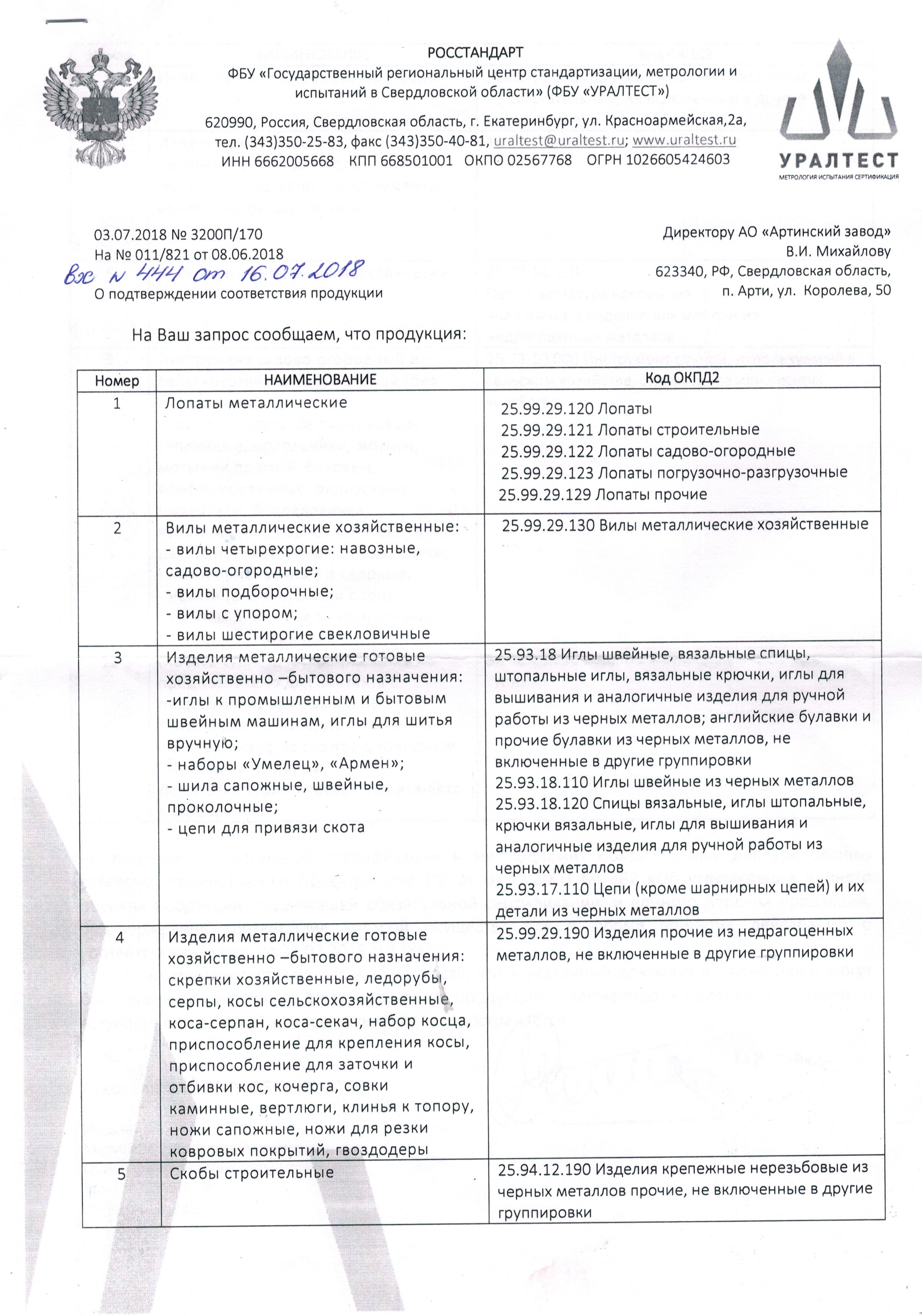 Государственная регистрация-не подлежит, Сертификция- информациноое письмо №3200П/170 от 03.07.18 выдано ФБУ"Государственный региональный центр сдандартизации, метрологии и испытаний в .свердловской области "ФБУ "УралТест"