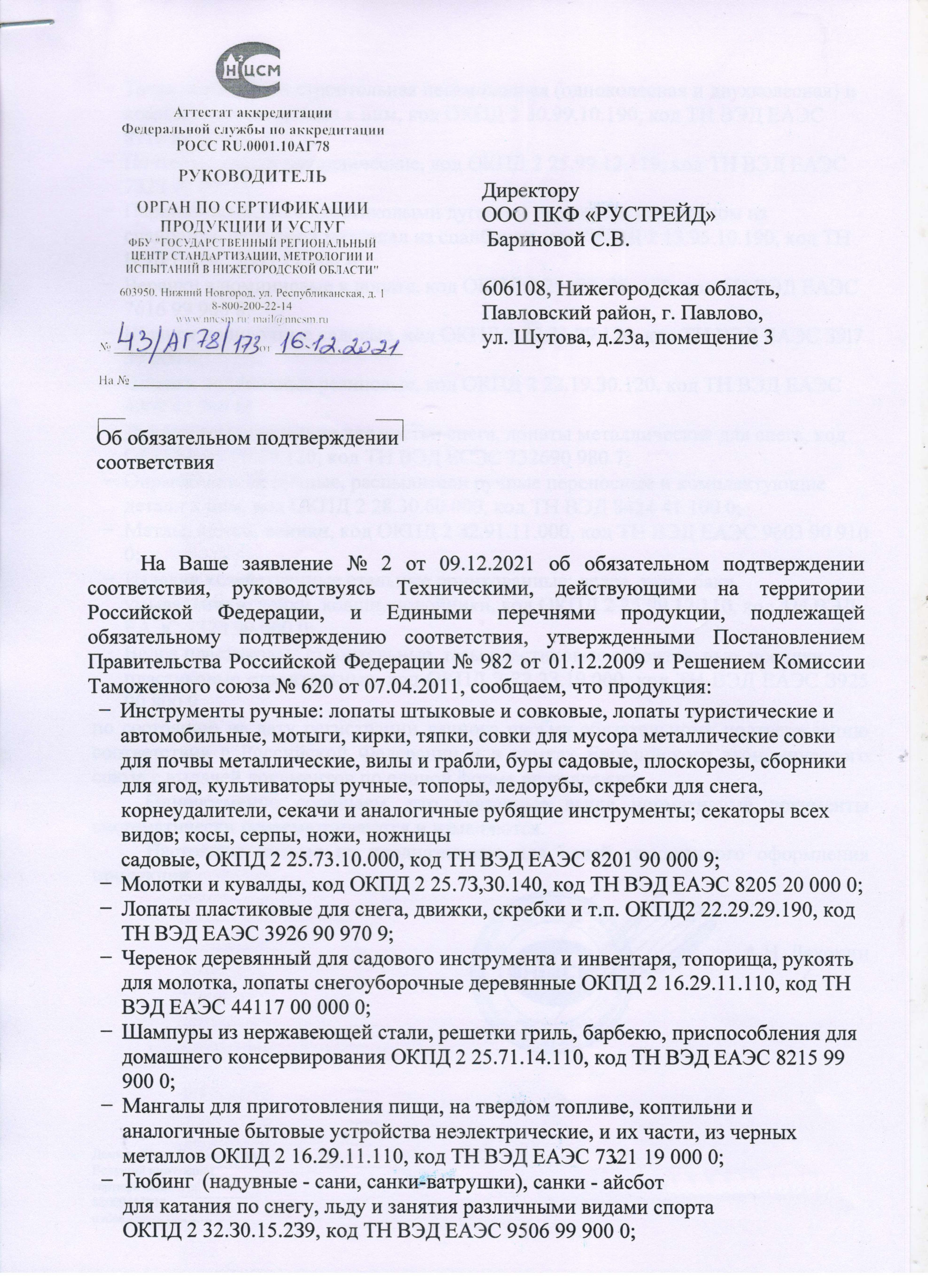 Сертификация - информационное письмо №43/АГ 78/173 от 13.12.21 выдано ФБУ "Государственный региональный центр стандартизации, метрологии и испытаний в Нижегородской обл."