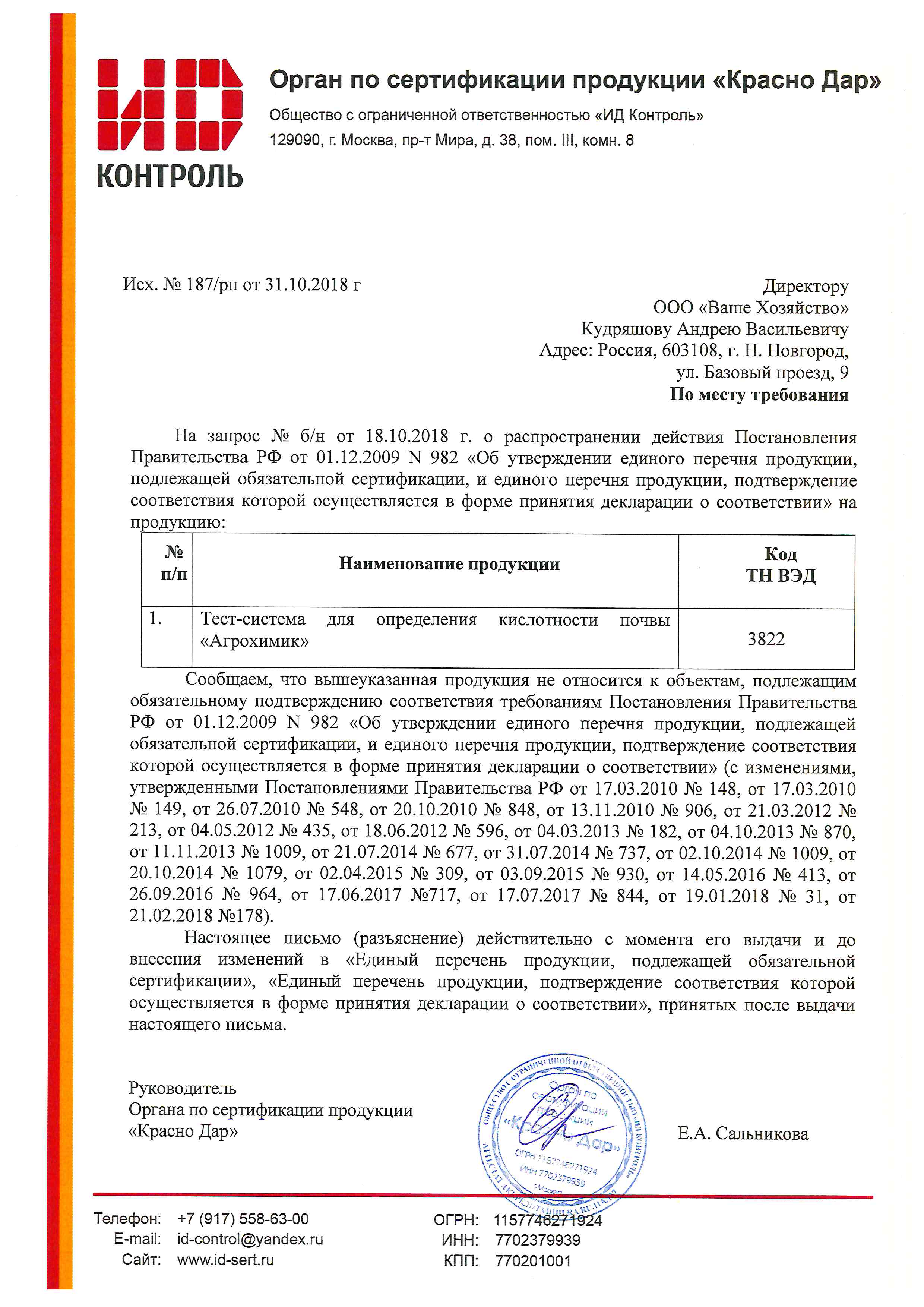Сертификация-информационное письмо №187/рп от 31.10.2018 г. выдано ОС продукции "Красно Дар"