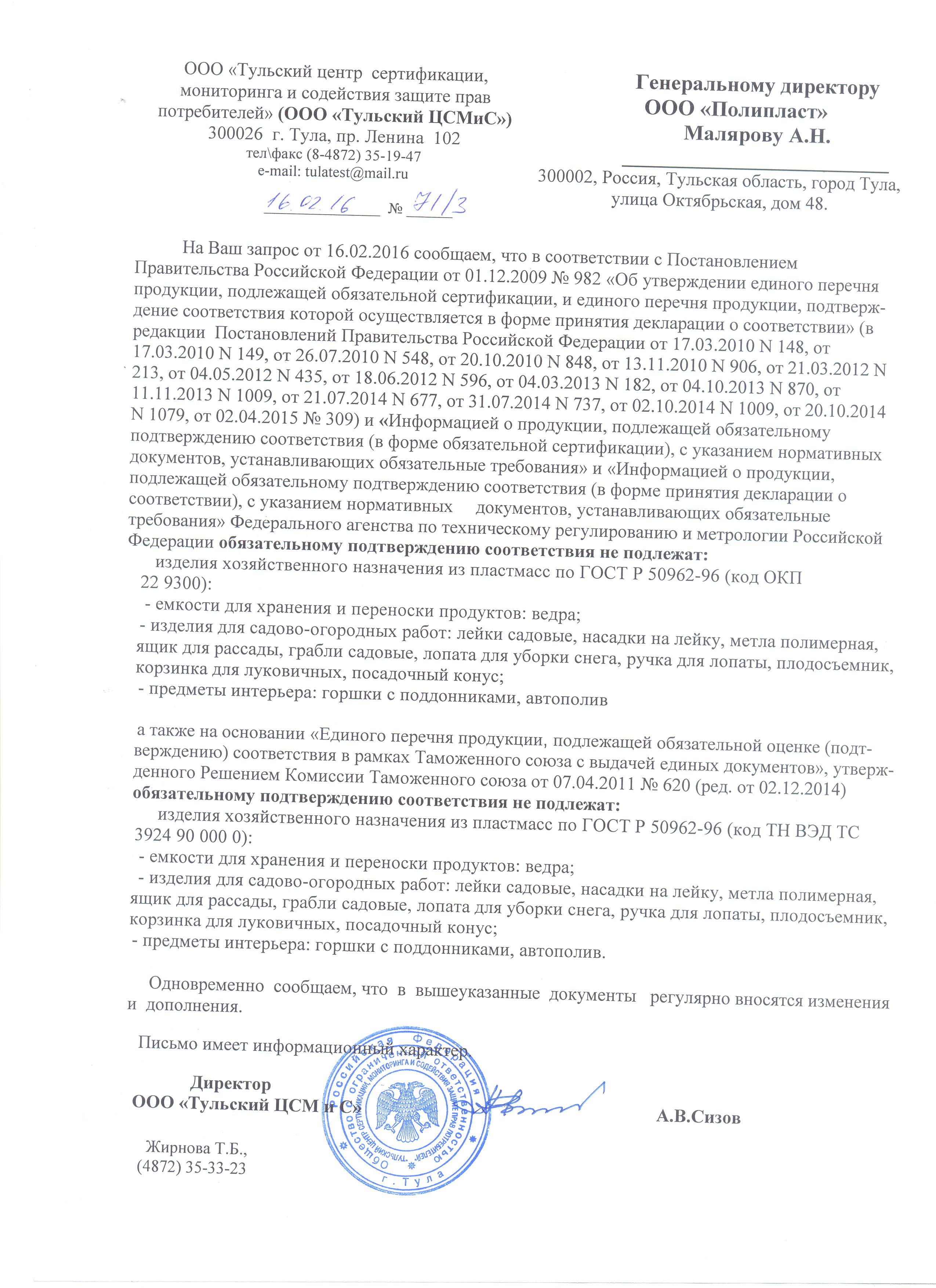 Сертификация-информационное письмо №71/3 от 16.02.16 выдана ООО "Тульский центр сертификации, мониторинга и содействия защите прав потребителей" ООО "Тульский ЦСМиС"