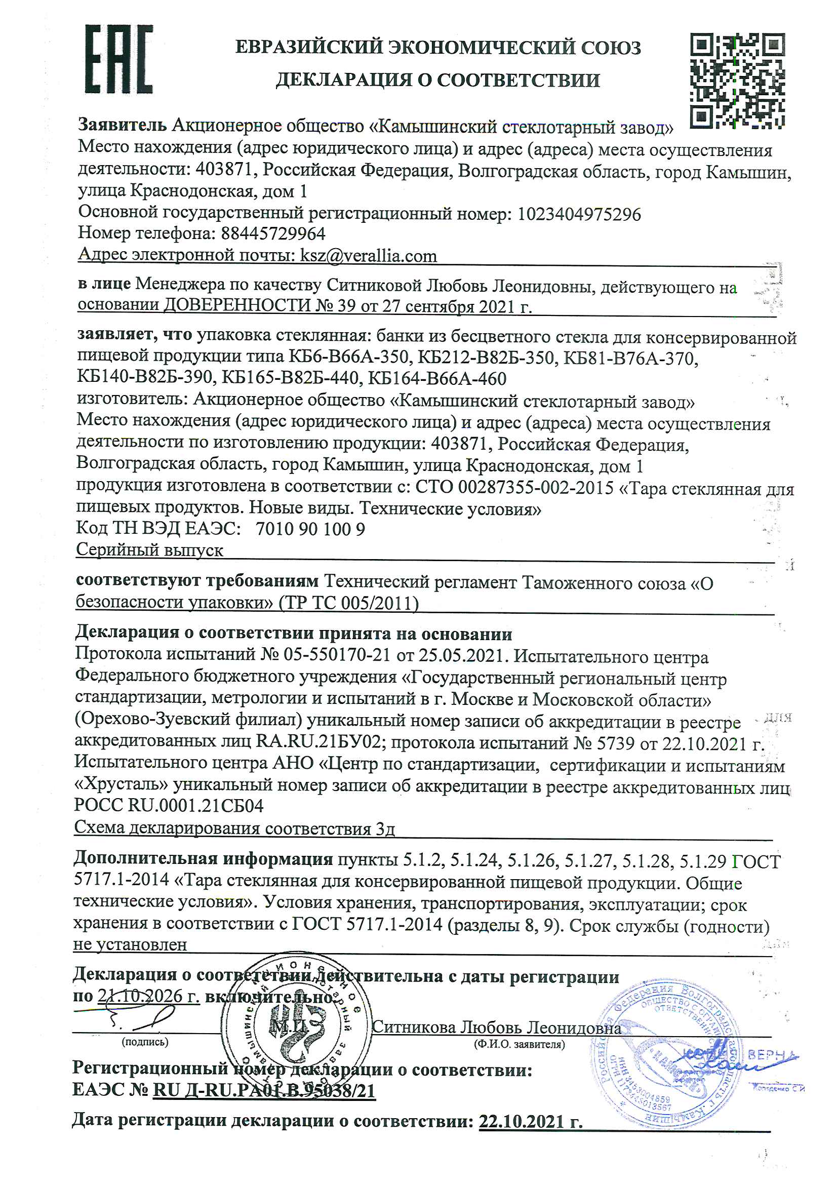 Сертификация-декларация ЕАЭС №RU Д.РА01.В.95038/21 от 22.10.21 до 21.10.26 выдана: заявитель- ЗАО "Камышинский стеклотарный з-д"