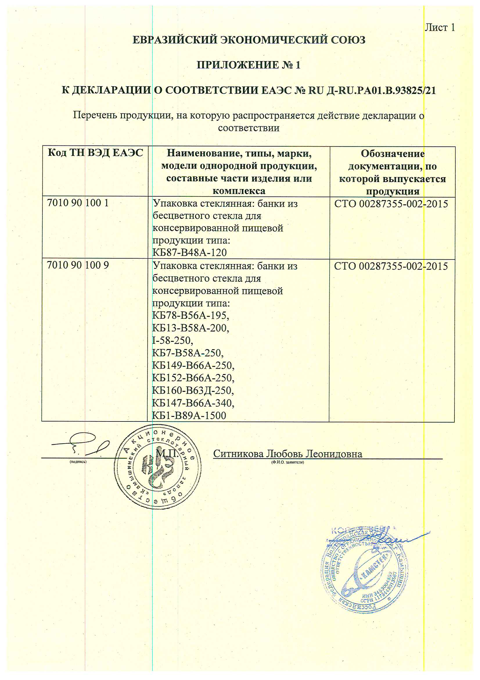 Сертификация-декларация ЕАЭС №RU Д-RU.РА02.В.07429/21 от 27.10.21 до 26.10.26 выдана: заявитель-ЗАО "Камышинский стеклотарный з-д"