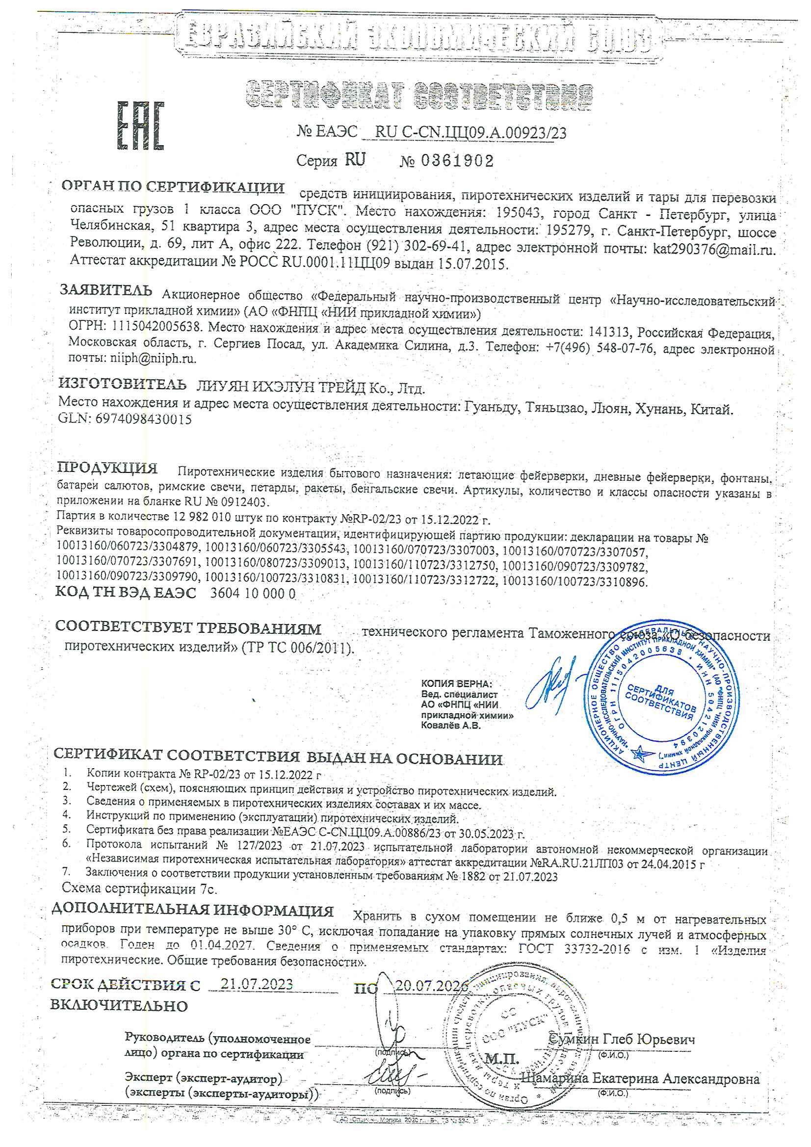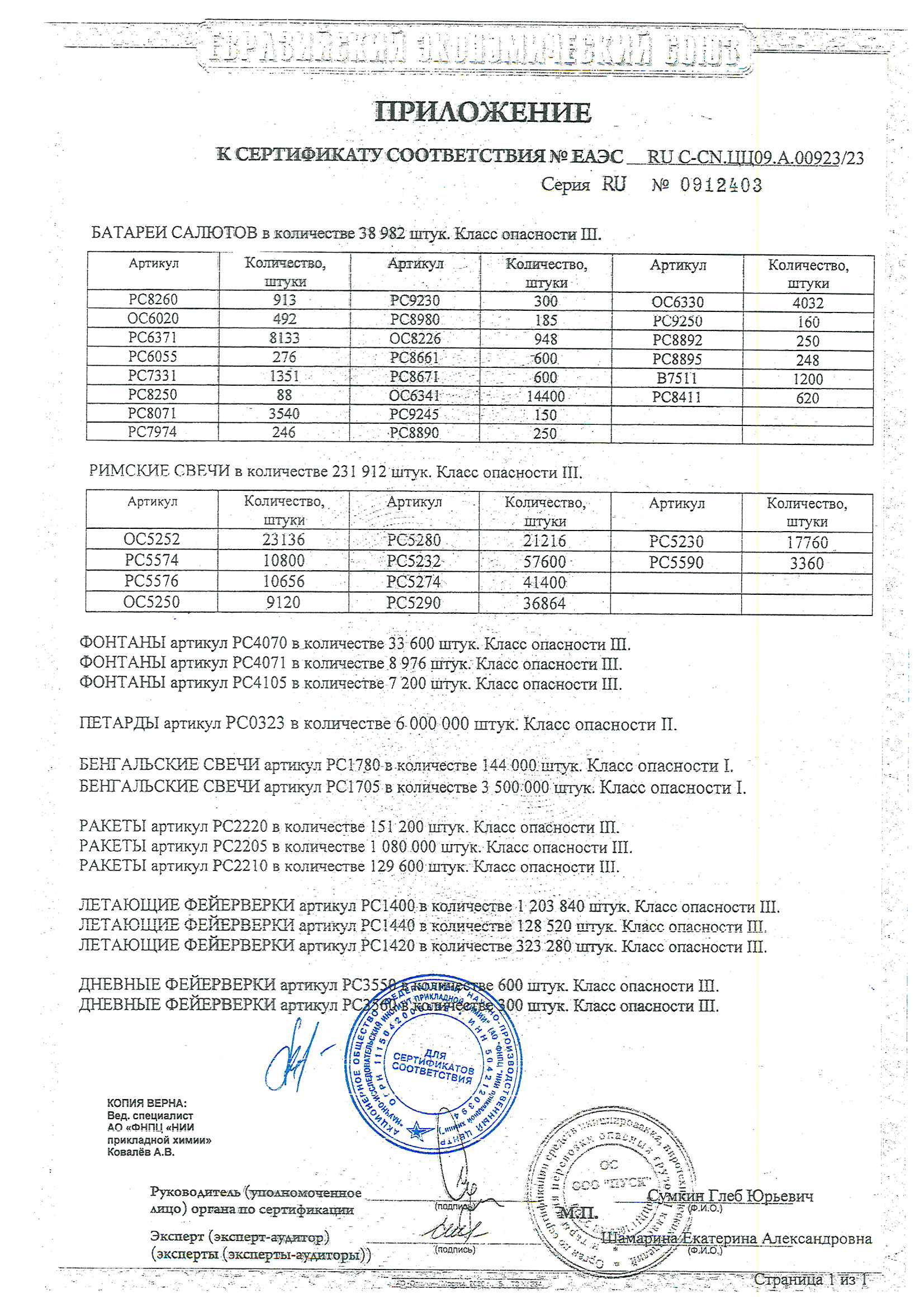 1. Золотые искристые и трещащие трассы разрываются сферами из: золотых форсов с серебряными искрами. 2. Красные, зелёные, синие и фиолетовые огни. 3. Золотые трещащие и зелёные огни. 4. Финал: красочный залп.