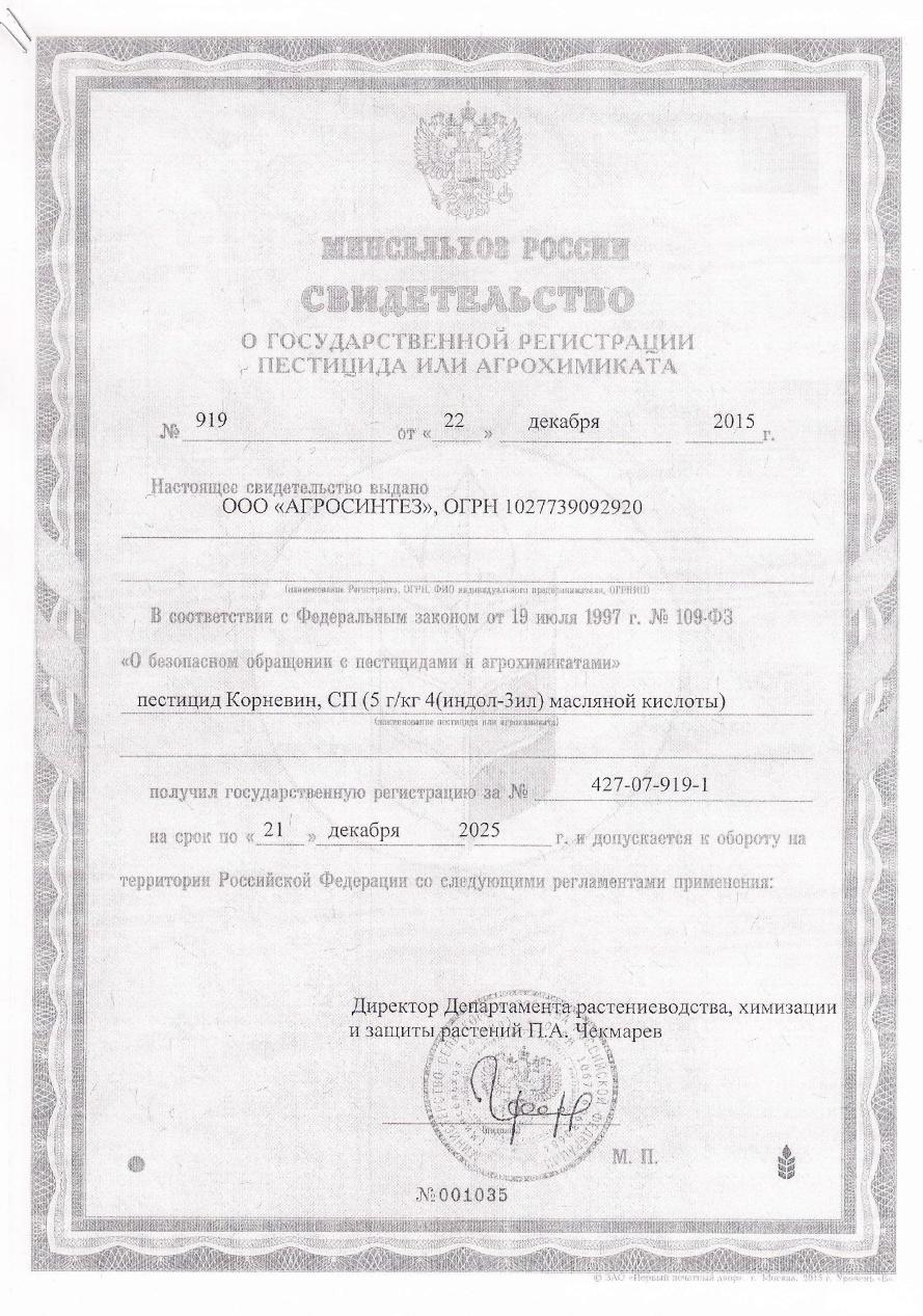 Государственная регистрация №427-07-919-1 от 22.12.15 до 21.12.25 выдана МСХ РФ, Сертификация-декларация №РОСС RU-Д-RU.РА01.В.29101/23 от 25.05.23 до 22.05.26 выдана: заявитель АО "Агросинтез"