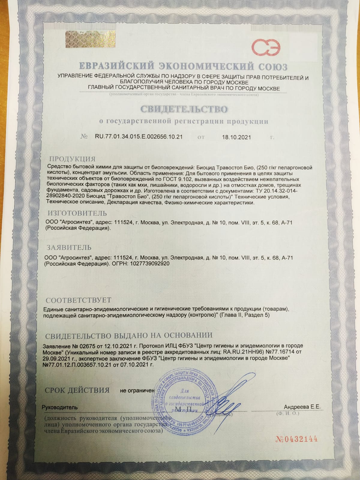 Государственная регистрация №RU.77.01.34.015.Е.002656.10.21, №0432144 от 18.10.21 выдана ФС по надзору в сфере благополучия и защиты прав потребителей по г. Москва., Сетрификация-информационное письмо №101-кс/639 от 02.11.21 выдано ОС продукции АО "ВНИИС"