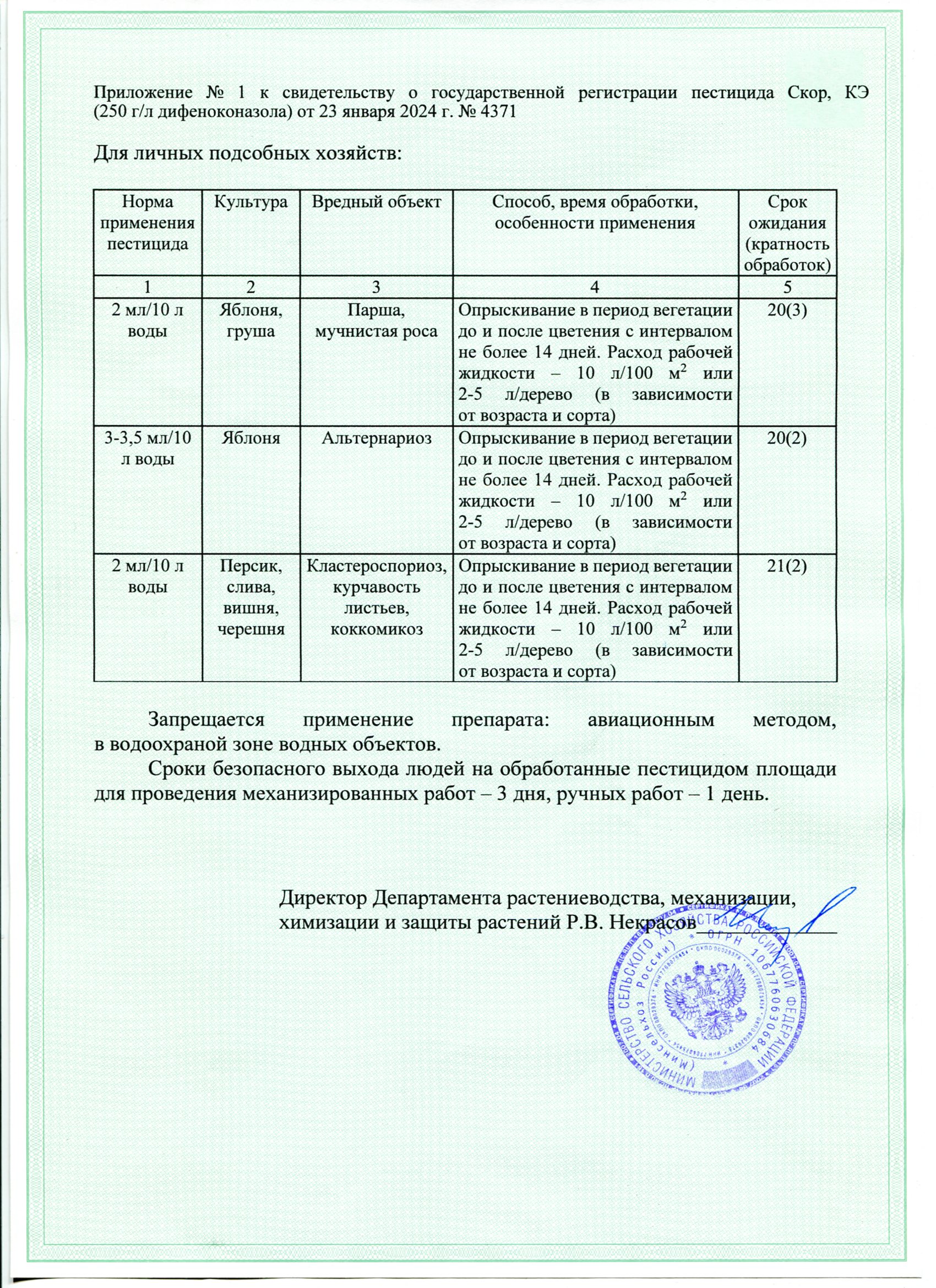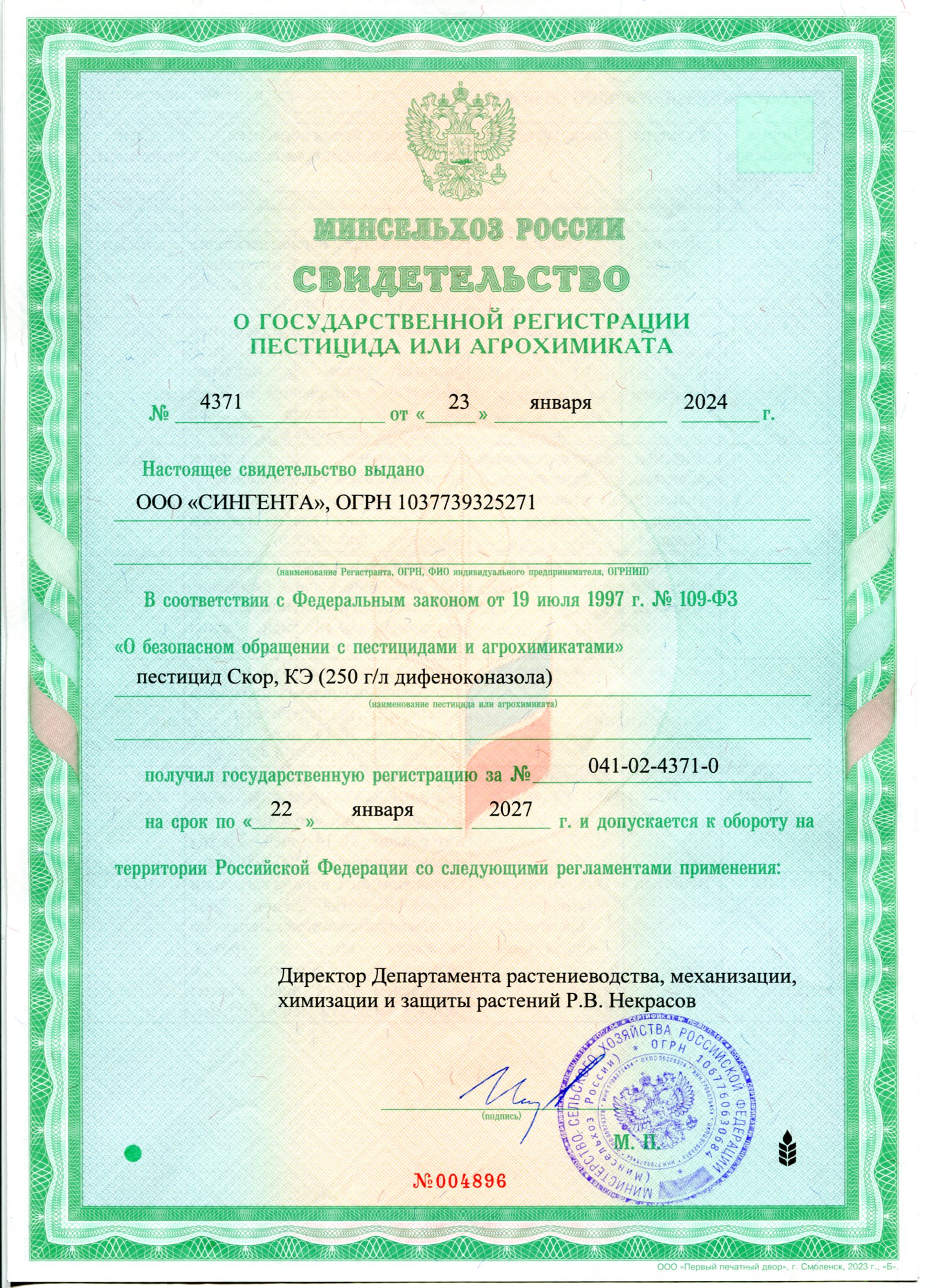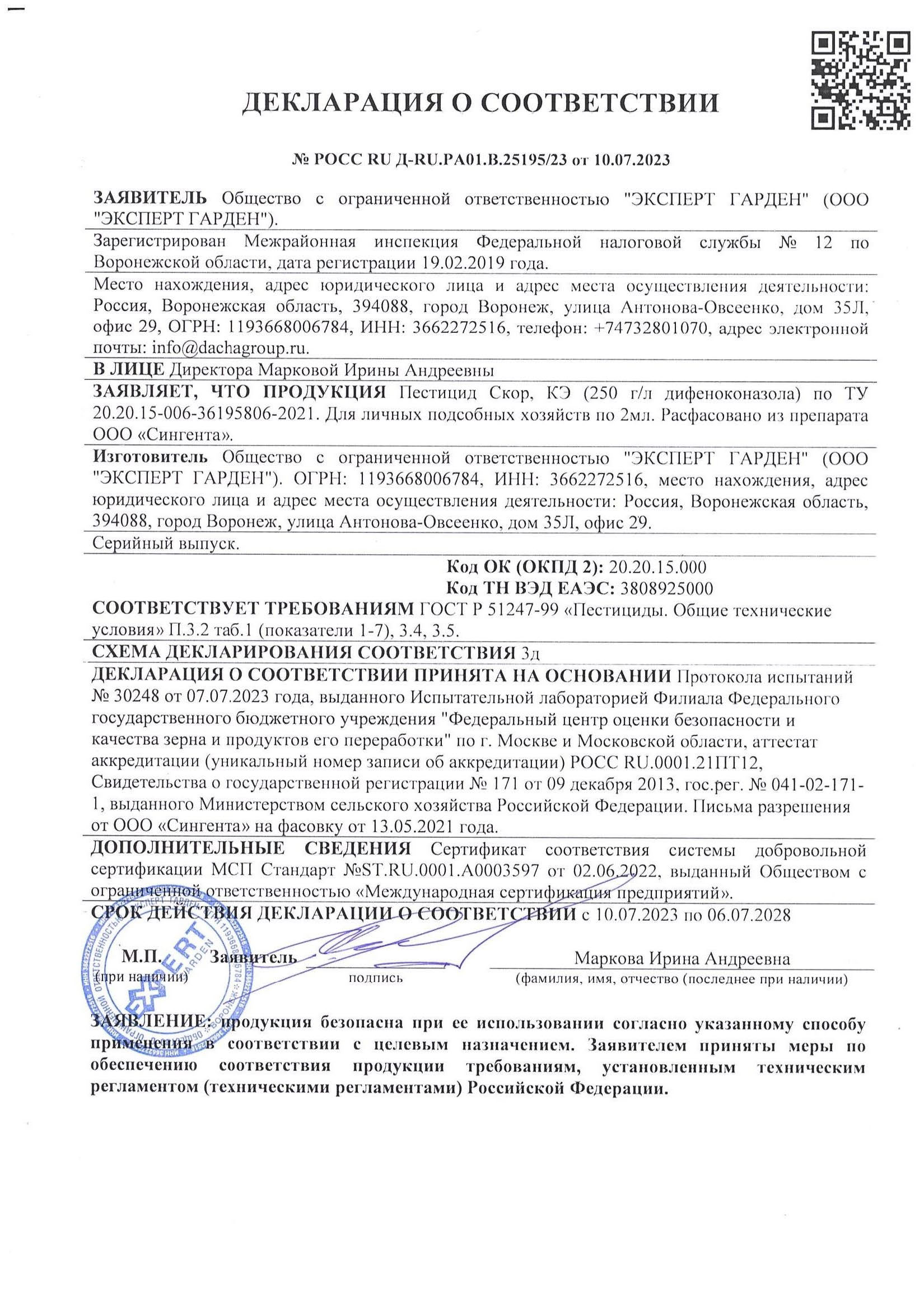 Государственная регистрация-№041-02-4371-0 от 23.01.24 до 22.01.27 выдана МСХ РФ, Сертификация-декларация №РОСС RU Д-RU.РА01.В.25195/23 от 10.07.23 до 06.07.28 выдана Заявитель: ООО "Эксперт Гарден"
