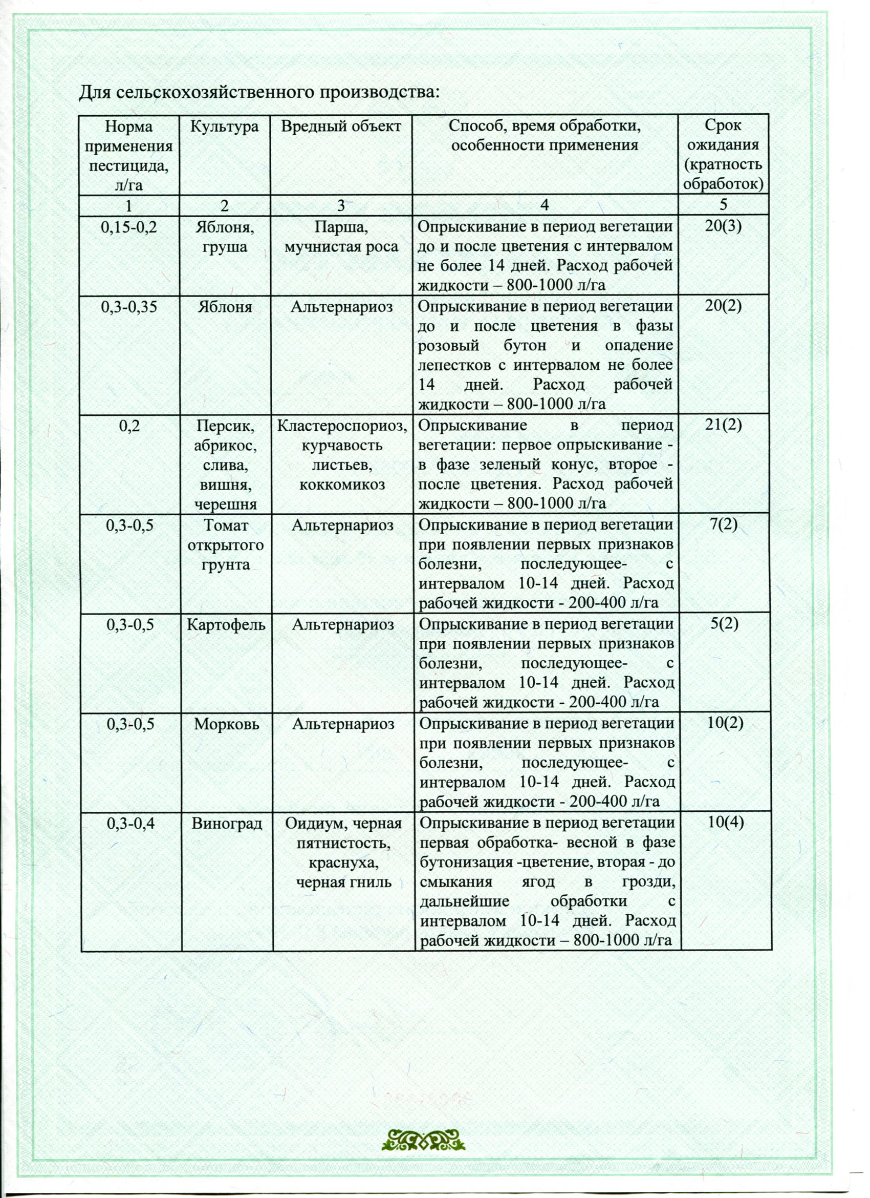 Рекомендован от альтернариоза, парши, мучнистой росы, курчавости листьев, клястероспориоза, коккомикоза и др. болезней.