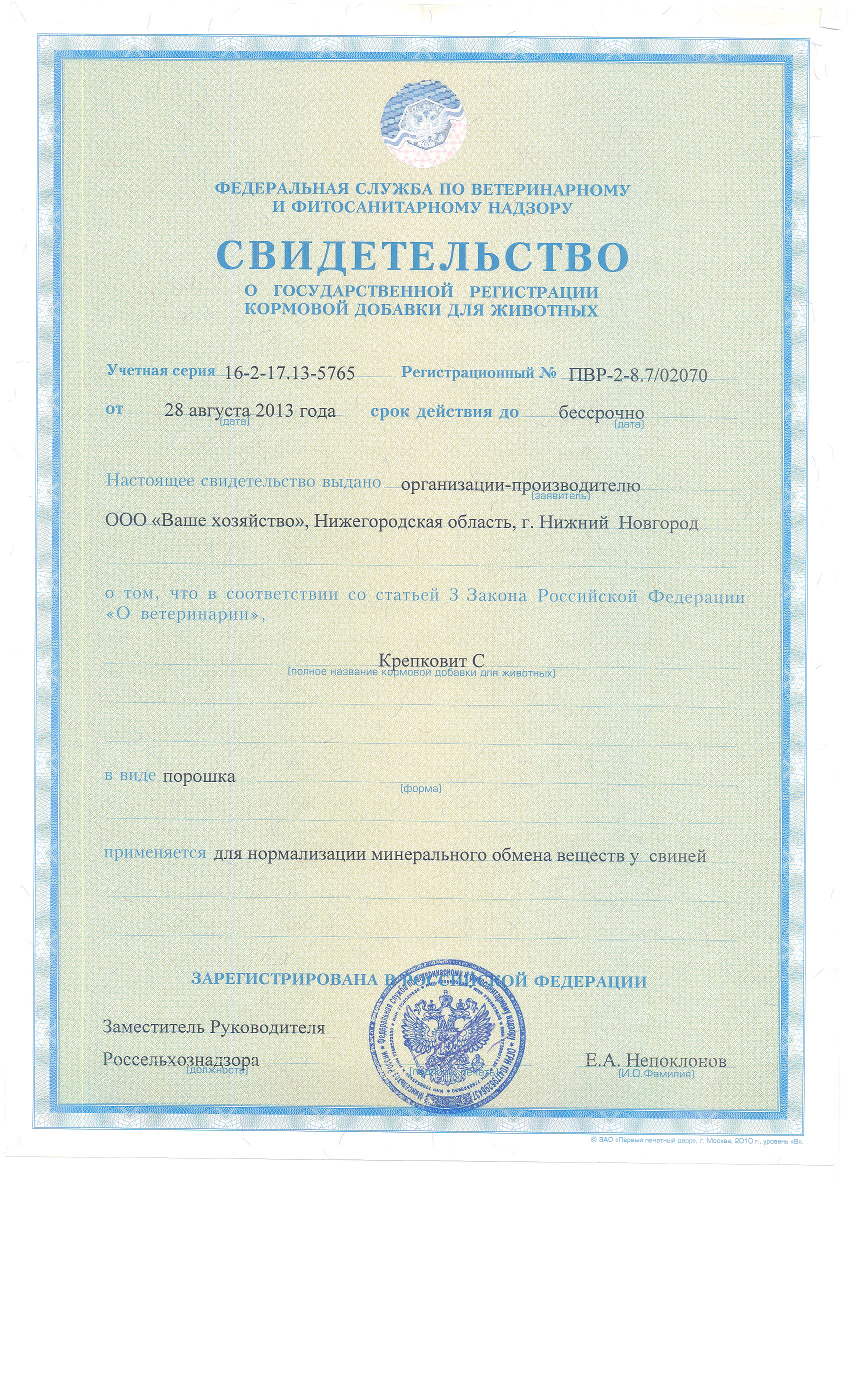 Государственная регистрация №ПВР-2-8,7/02070 от 28.08.13 ФС по ветеринарному и фитосанитарному надзору, Сертификация-информационное письмо №182 от 22.03.2017 выдано ООО"Идеал Тест"