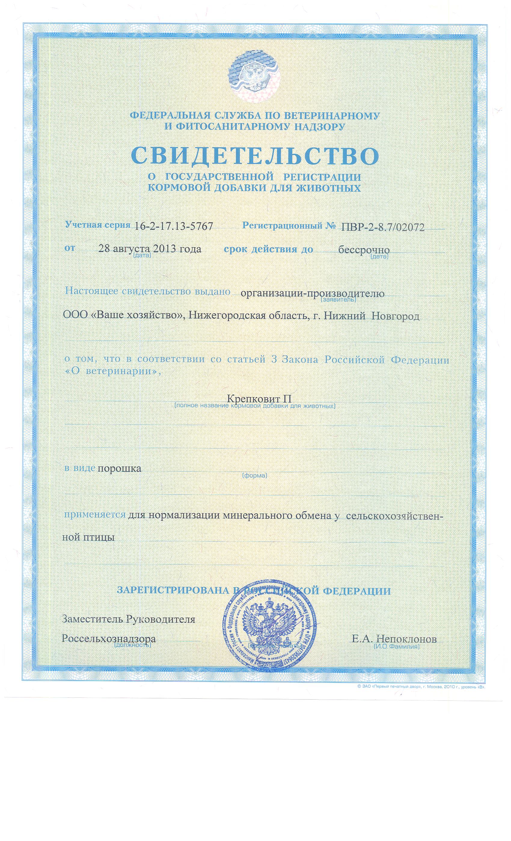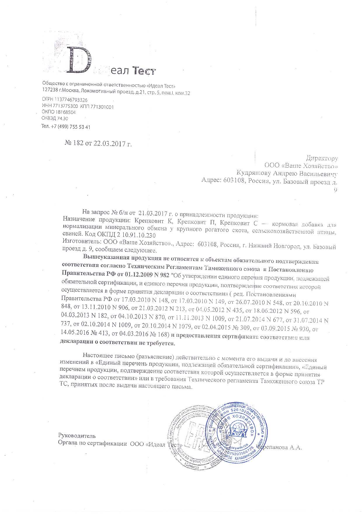 Государственная регистрация №ПВР-2-8.7-02072 выдано ФС по ветеринарному и фитосанитарному надзору, Сертификация-информационное письмо №182 от 22.03.2017 выдано ООО"Идеал Тест"