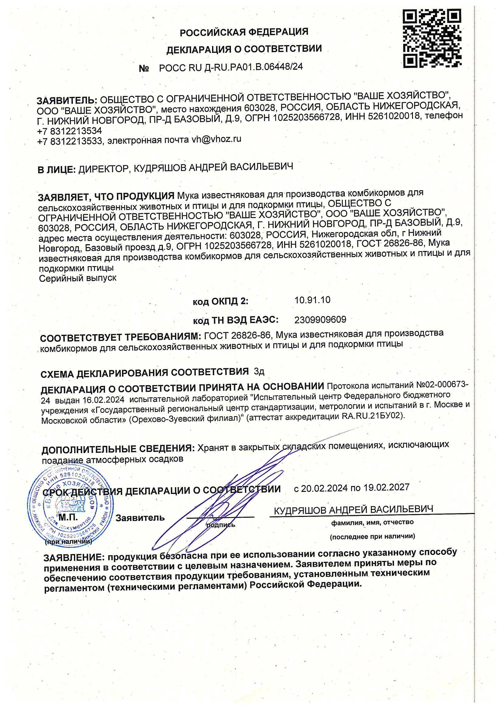 Хранение: в закрытых складских помещениях, исключающих попадание атмосферных осадков и засорения продукта.