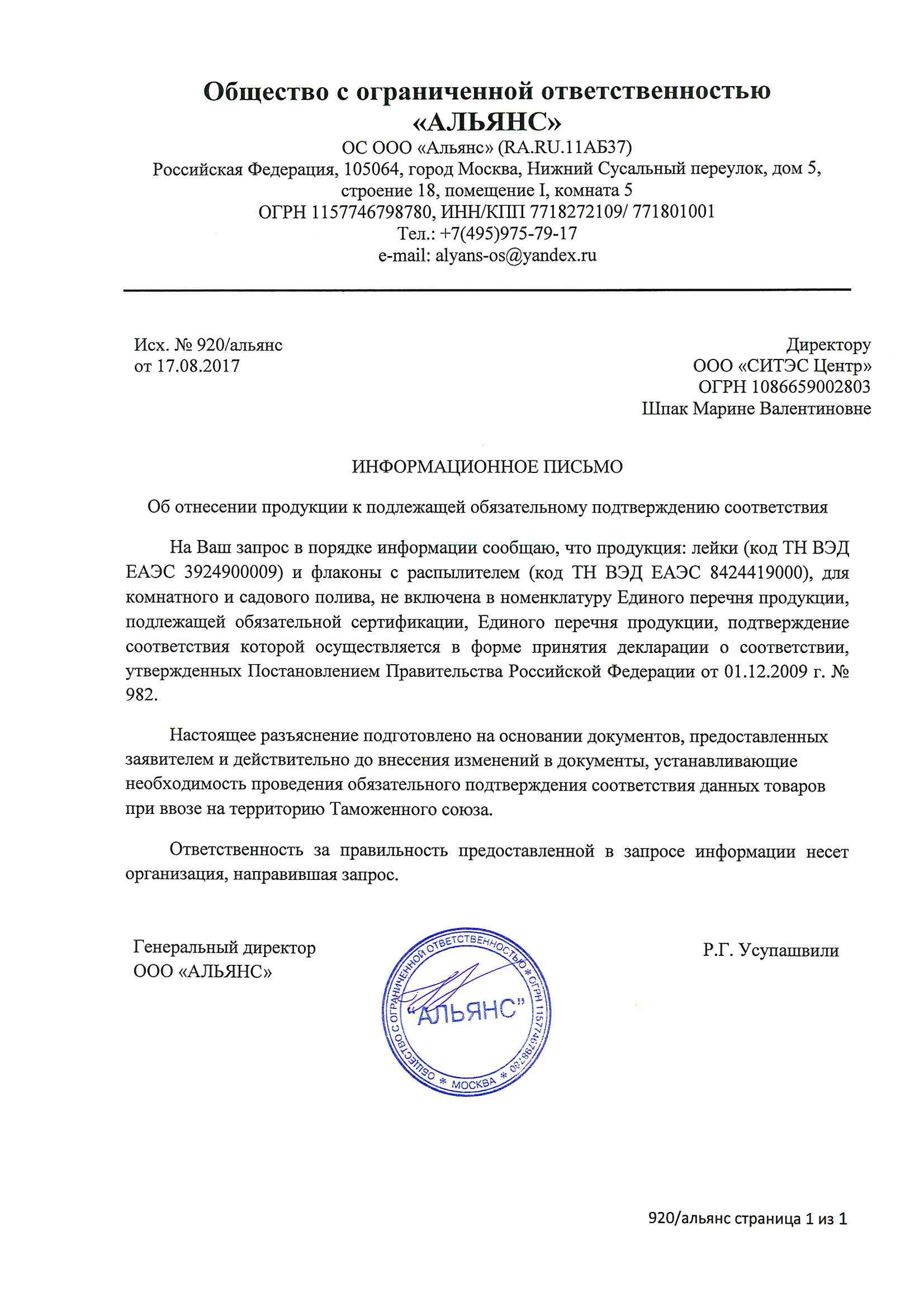 Государственная регистрация-не подлежит, Сертификация-информационное письмо №920/альянс от 17.08.17 выдано ОС продукии ООО "Альянс", г. Москва.