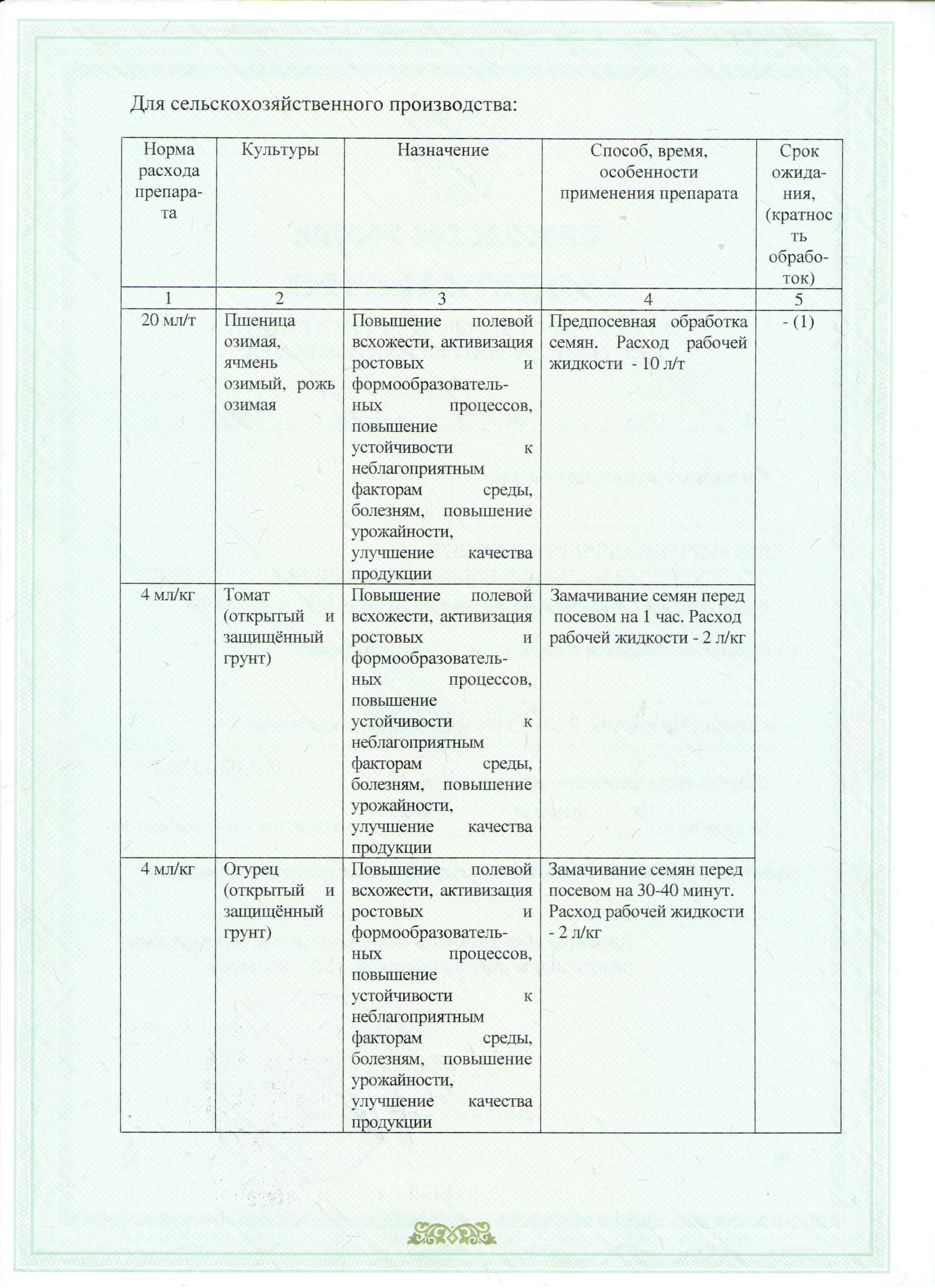 Предпосевная обработка семян: Замачивание семян: огурец - в течение 30-40 мин.; томат, капуста, морковь - в течение 1 часа; лук - в течение 0,5-1 часа. Расход - 2 мл/г. Горох - опрыскивание семян. Расход - 100 мл/10 кг.