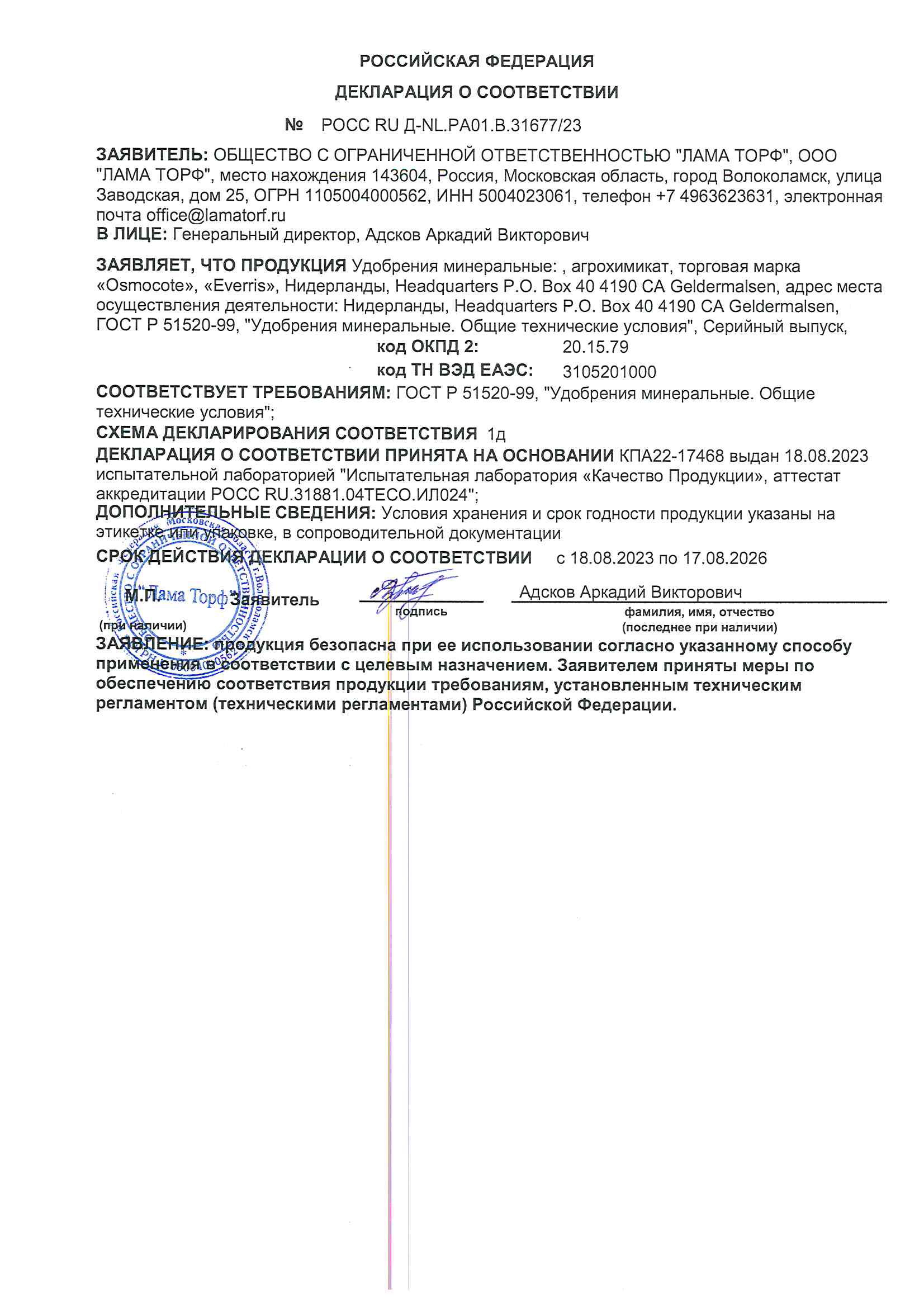 Состав: N (Азот) 12% P (Фосфор) 8% К (Калий) 19% Предназначен для выращивания цветочно-декоративных и плодово-ягодных культур, имеющих повышенные требования к калийному питанию, либо при повышенном содержании азота в поливной воде. Применение: цветочно-декоративные, плодово-ягодные культуры (контейнерные, горшечные растения) — внесение при приготовлении питательного субстрата; подкормка 1 раз в 5-6 месяцев из расчета 3-5 гр/литр субстрата; цветочно-декоративные культуры (многолетние) — внесение при приготовлении питательного сусбтрата для выращивания рассады, укоренения черенков из расчета 2-3,5 гр./литр субстрата цветочно-декоративные культуры (многолетние) — внесение перед посевом (посадкой) из расчета 200-350 гр/м.куб.