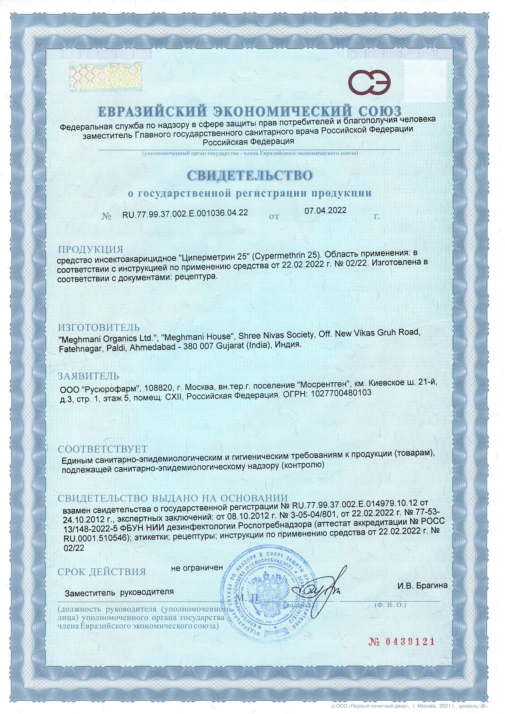 Средство инсектоакарицидное Циперметрин 25% к.э. представляет собой концентрат эмульсии в виде однородной жидкости от бледно-желтого до желтого цвета с запахом ароматизатора. Относится к 4 классу малоопасных веществ.