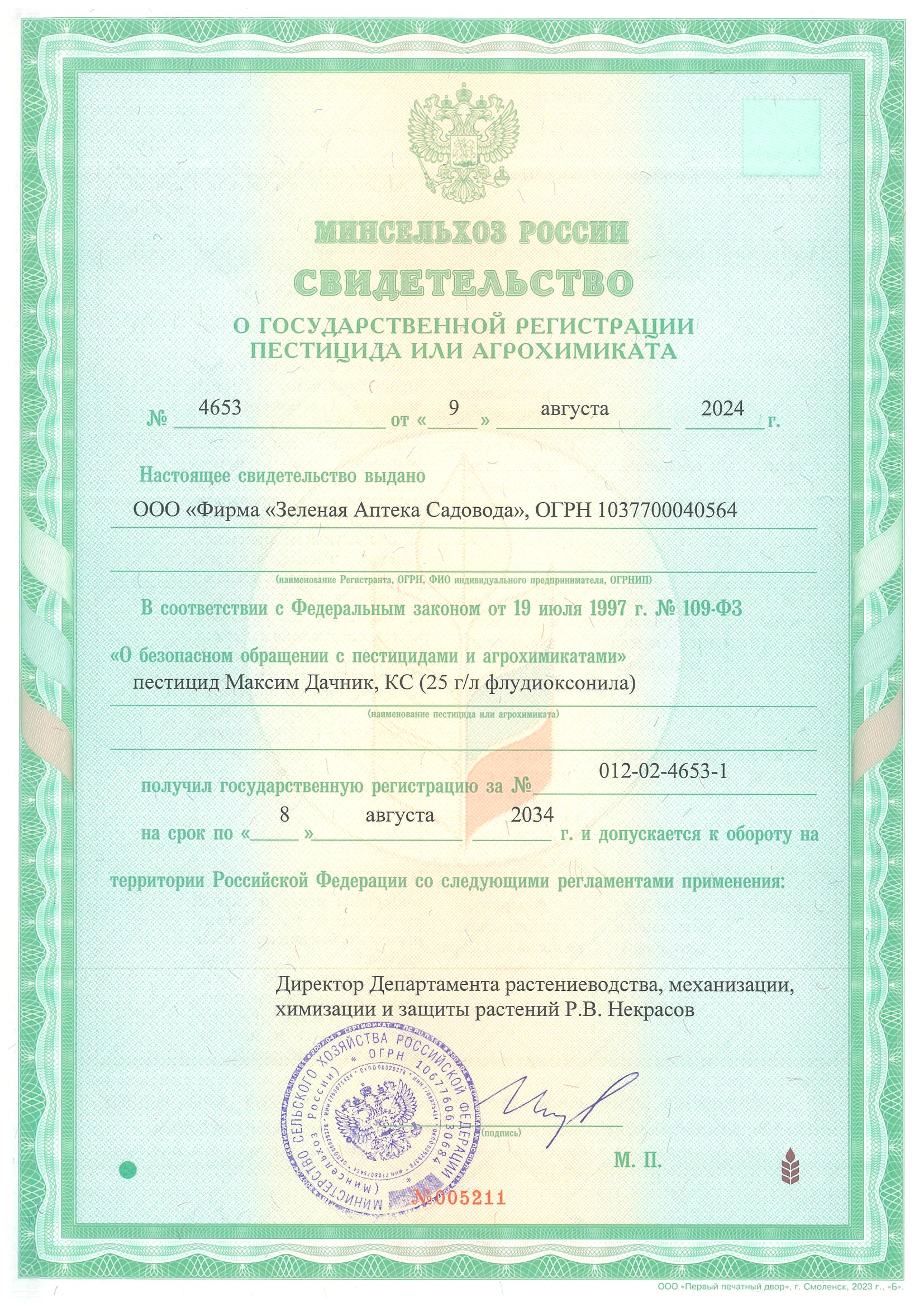 Государственная регистрация №012-02-4653-1 от 09.08.24 до 058.08.34 выдана МСХ РФ; Сертификация- декларация №РОСС RU Д-RU.РА01.В.39357/24 от 30.09.24 до 29.09.29 выдана Заявитель: ООО "Фирма"Зеленая Аптека Садовода"