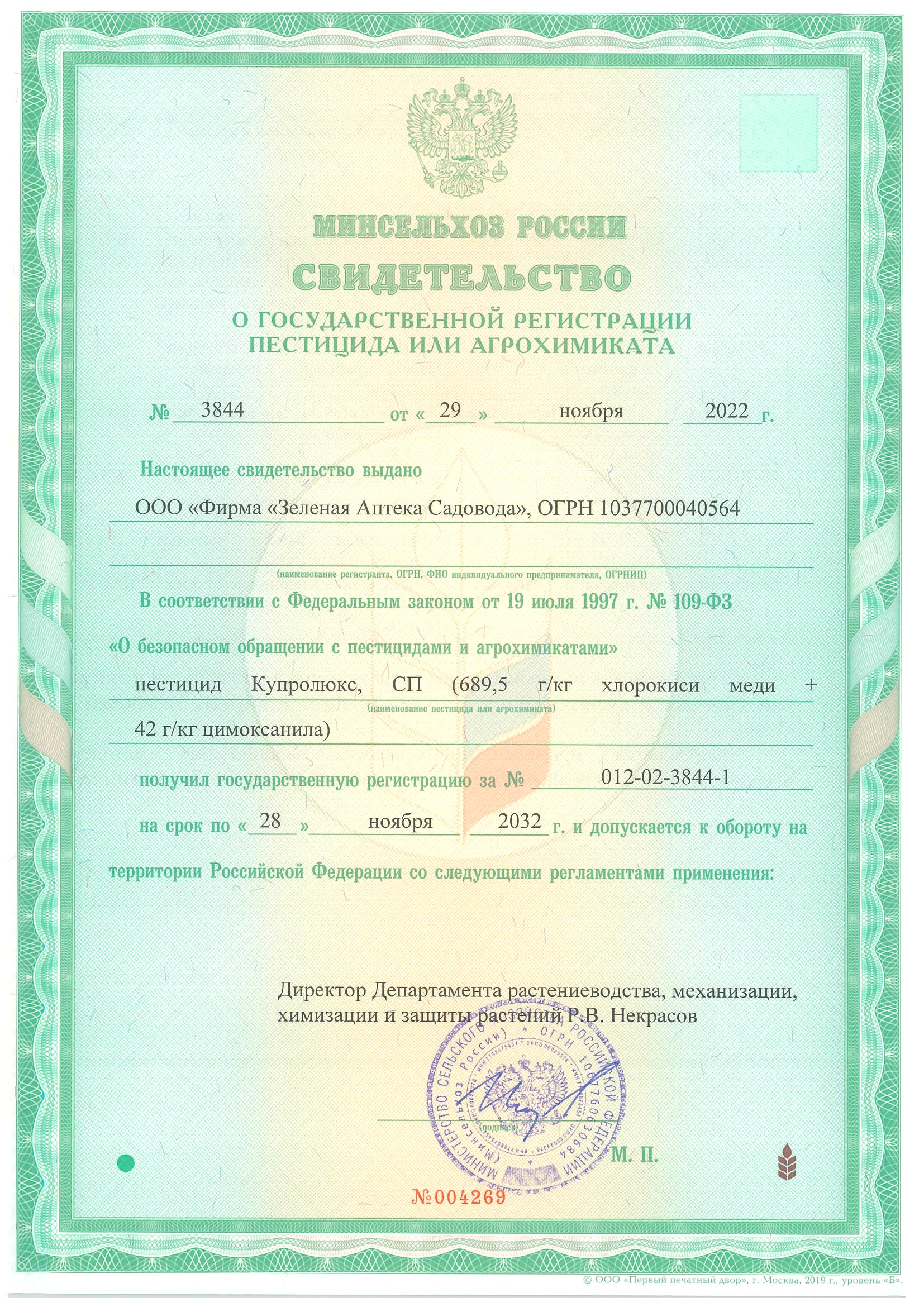 Государственная регистрация-№012-02-3844-1 от 29.11.22 до 28.11.32 выдана МСХ РФ; Сертификация-декларация №РОСС RU Д-RU.РА01.В.04532/23 от 13.02.23 до 12.02.33 выдана Заявитель: ООО "Фирма "Зеленая аптека садовода"