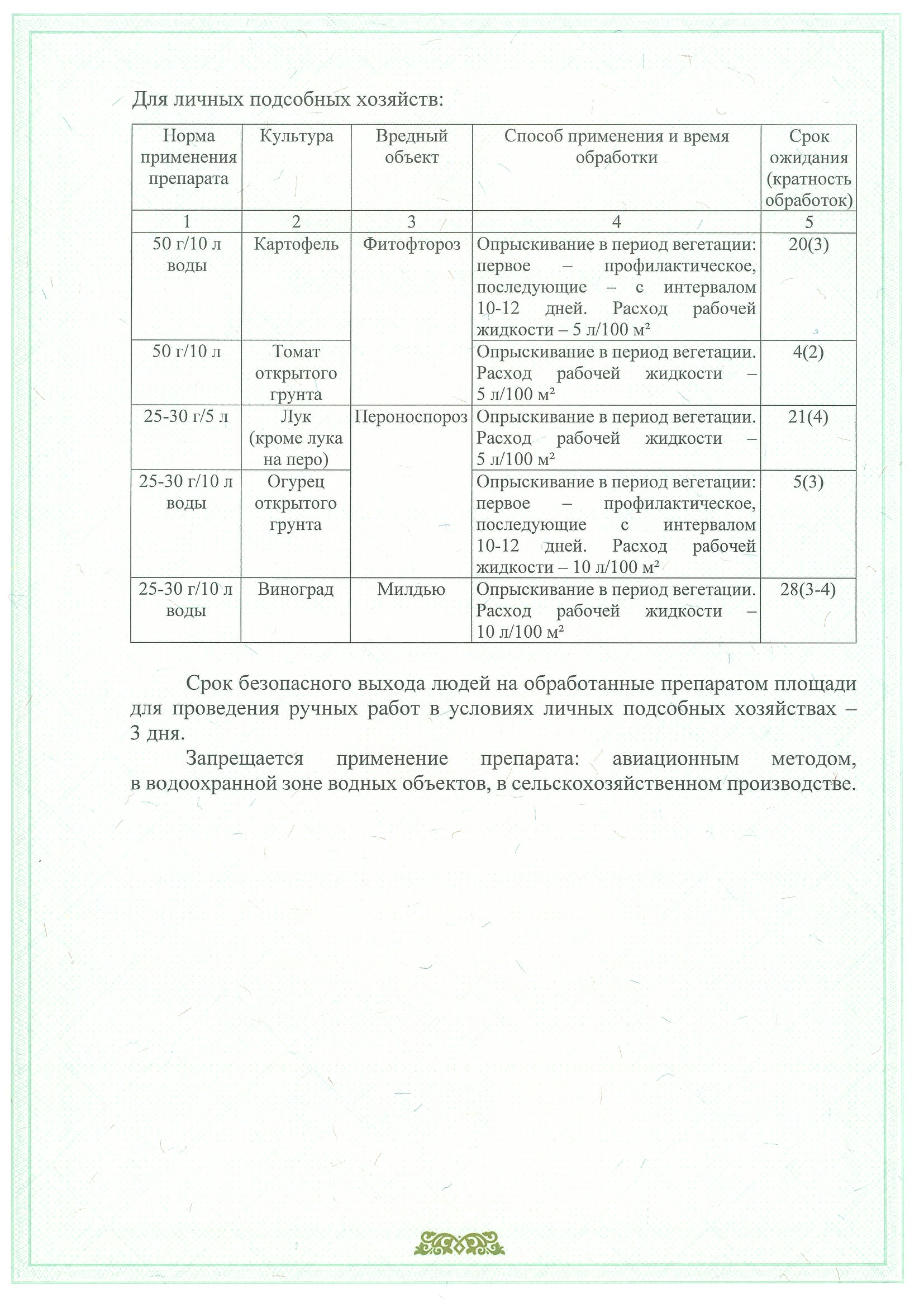 Первую обработку проводить профилактически до появления признаков заболевания. Картофель – до смыкания ботвы в рядках, томаты, огурцы – в период бутонизации, лук – активный рост стрелок, виноград – до цветения. Последующие с интервалом 10-12 дней.