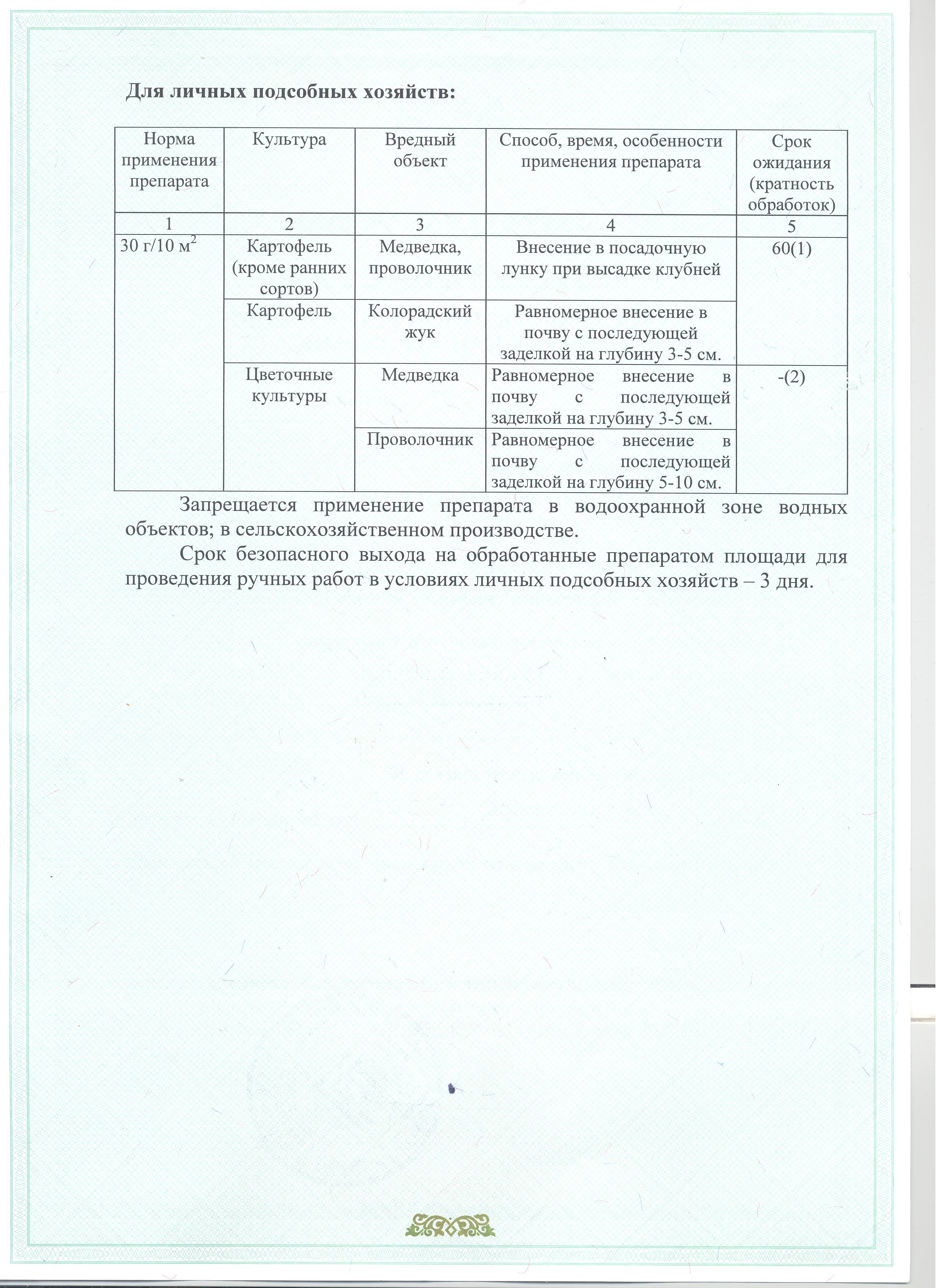 готовая приманка для защиты растений от медведки и проволочника. Для личных подсобных хозяйств. СПОСОБ ПРИМЕНЕНИЯ: Равномерно внести гранулы в почву с последующей заделкой на глубину 3-5 см (от медведки) и на глубину 5-10 см (от проволочника); внести гранулы в почву на глубину 5-10 см до посадки клубней (луковиц растений) или в период вегетации (от проволочника). Расход 30 г на 10 кв.м. Смешивать с другими препаратами и гранулированными удобрениями запреща¬ется. Препарат не оказывает фитотоксического действия на защищаемые культуры. Скорость воздействия: гибель насекомых наступает в течение 3-х часов после поедания приманки.