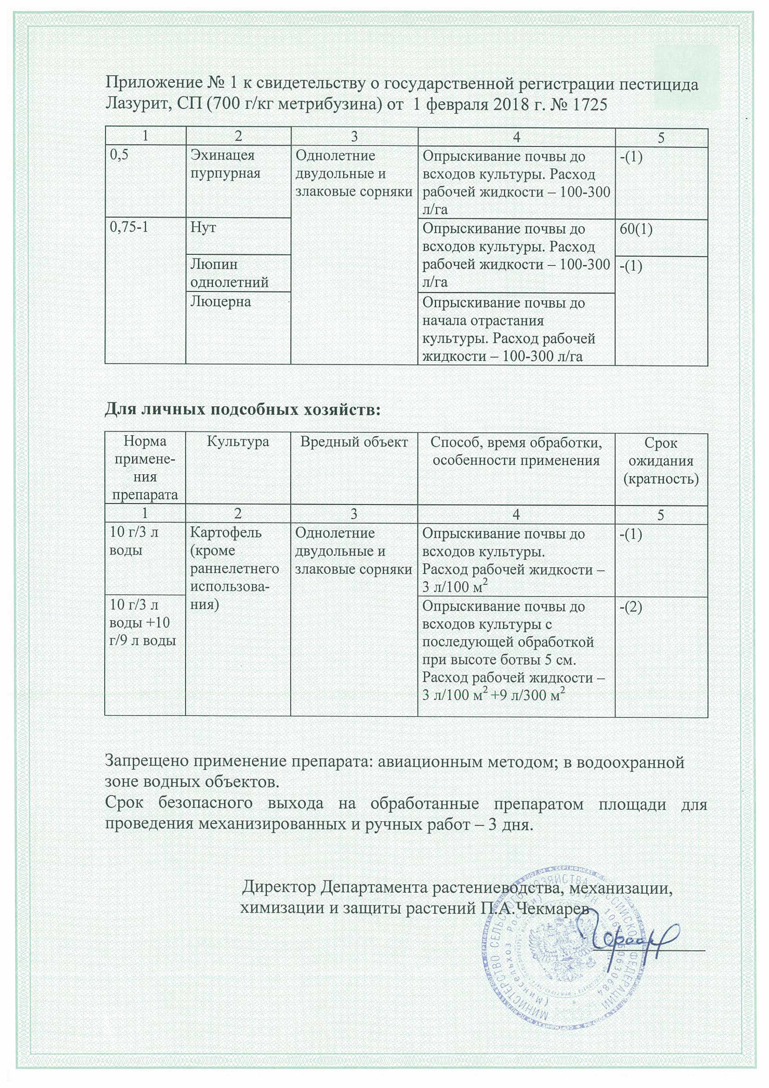 Картофель                      Однолетние двудольные и злаковые сорняки(лебеда,марь(виды),амброзия,бодяк,щирица и др.)            10 г/3 л воды                      Опрыскивание почвы до всходов культуры. Кратность обработок – 1 раз за сезон.Расход рабочей жидкости: 3л/100м².