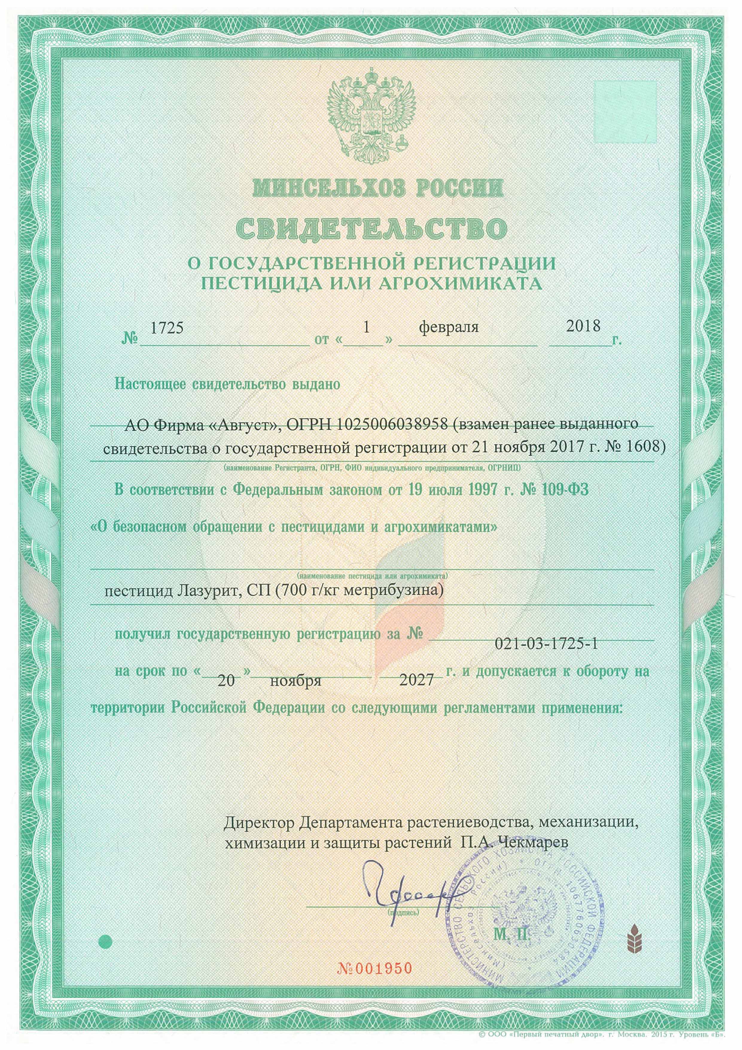 Государственная регистрация №021-03-1725-1 от 01.02.2018 до 20.11.2027 выдана МСХ РФ, Сертификация - декларация №РОСС RU Д-RU.РА01.В.33603/22 от 16.09.22 до 202.11.27 выдана Заявитель: АО Фирма "Август"