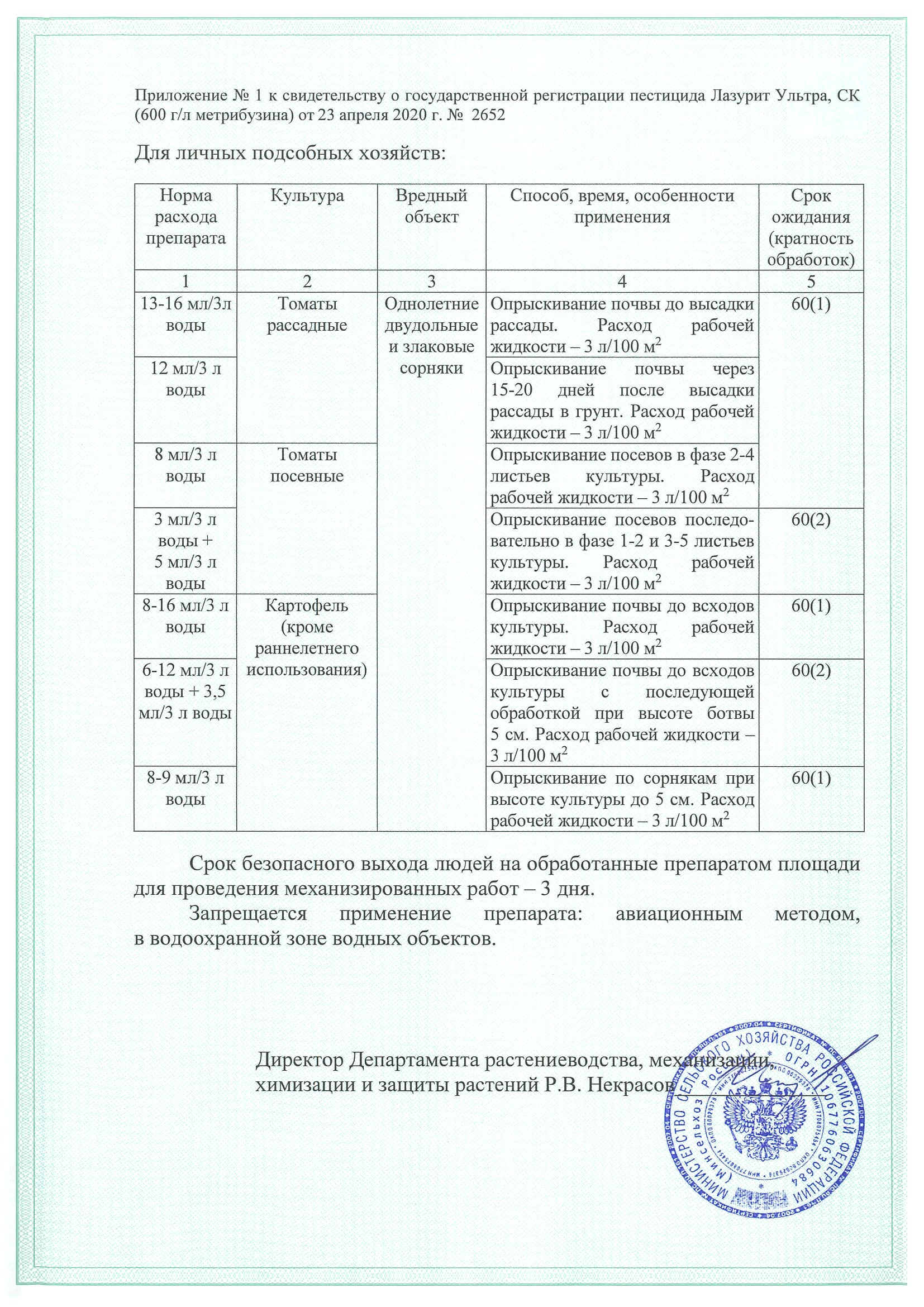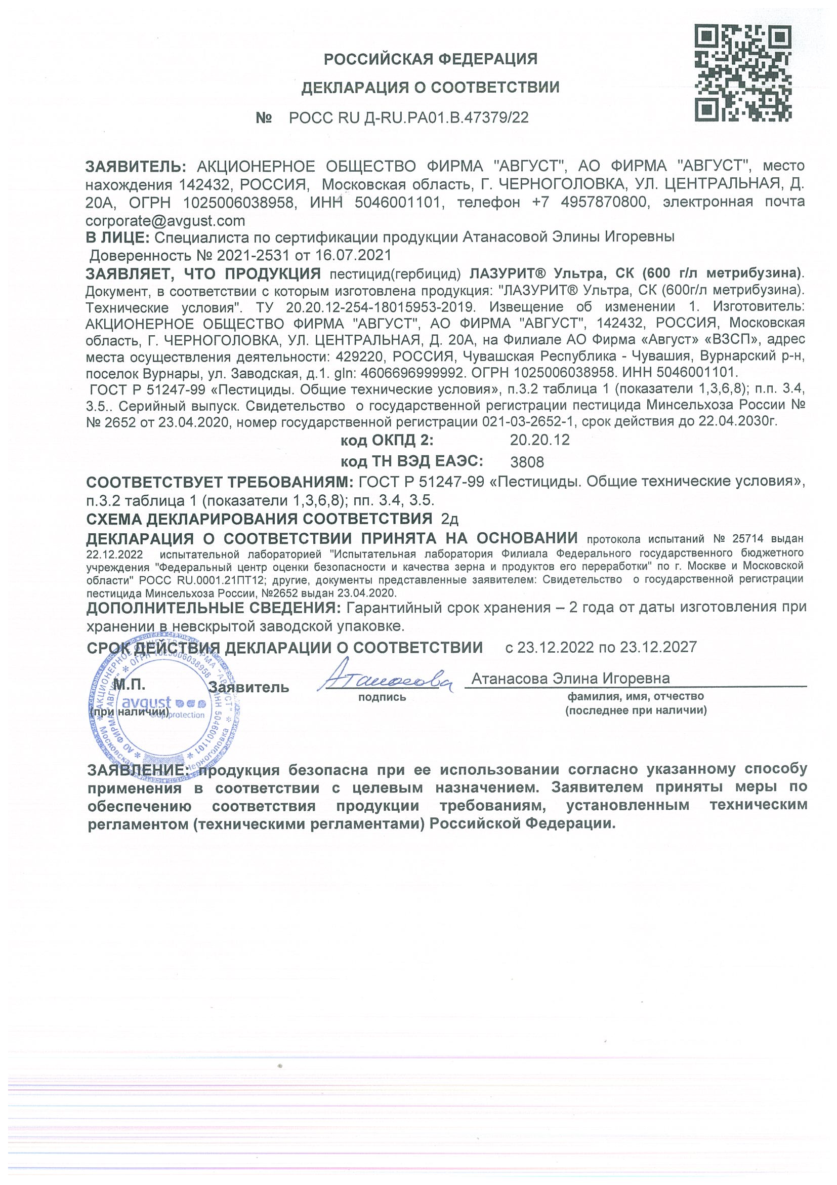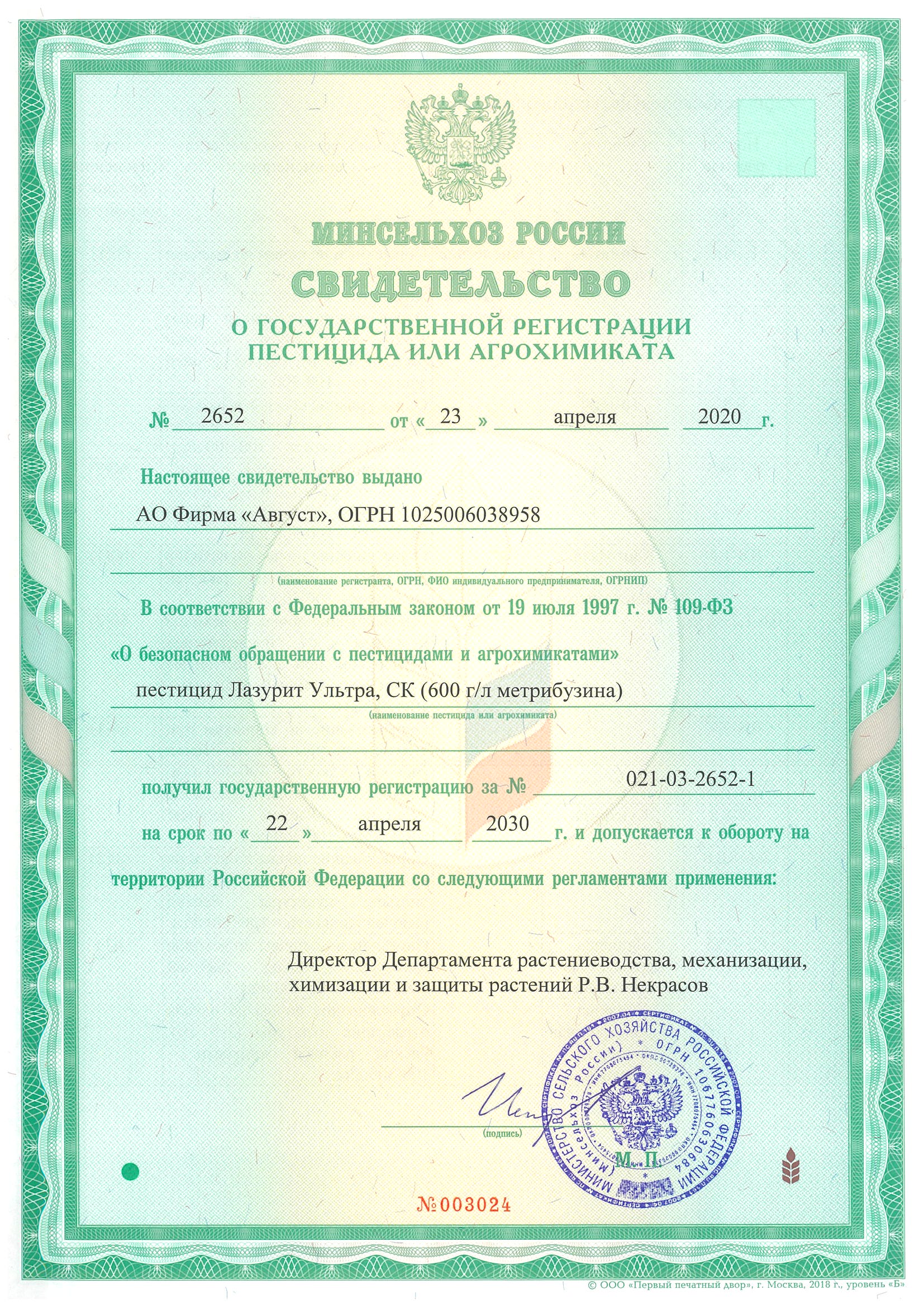Государственная регистрация №021-03-2652-1 от 23.04.20 до 22.04.30 выдана МСХ РФ, Сертификация-декларация №РОСС RU Д-RU.РА01.В.47279/22 от 23.12.22 до 23.12.27 выдана Заявитель: АО "Август"