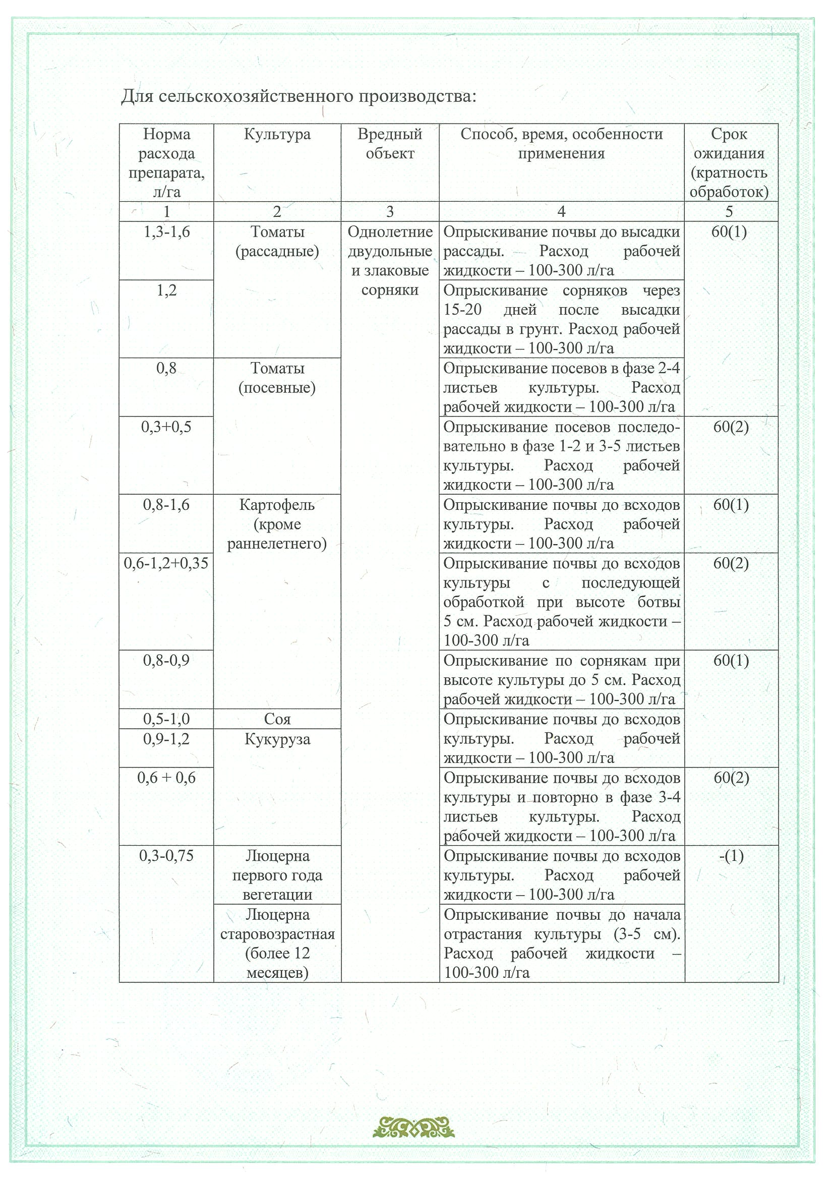 Уничтожает амброзию, горцы, звездчатку, марь, мятлик, осот, ромашку, щирицу и множество других сорных растений.