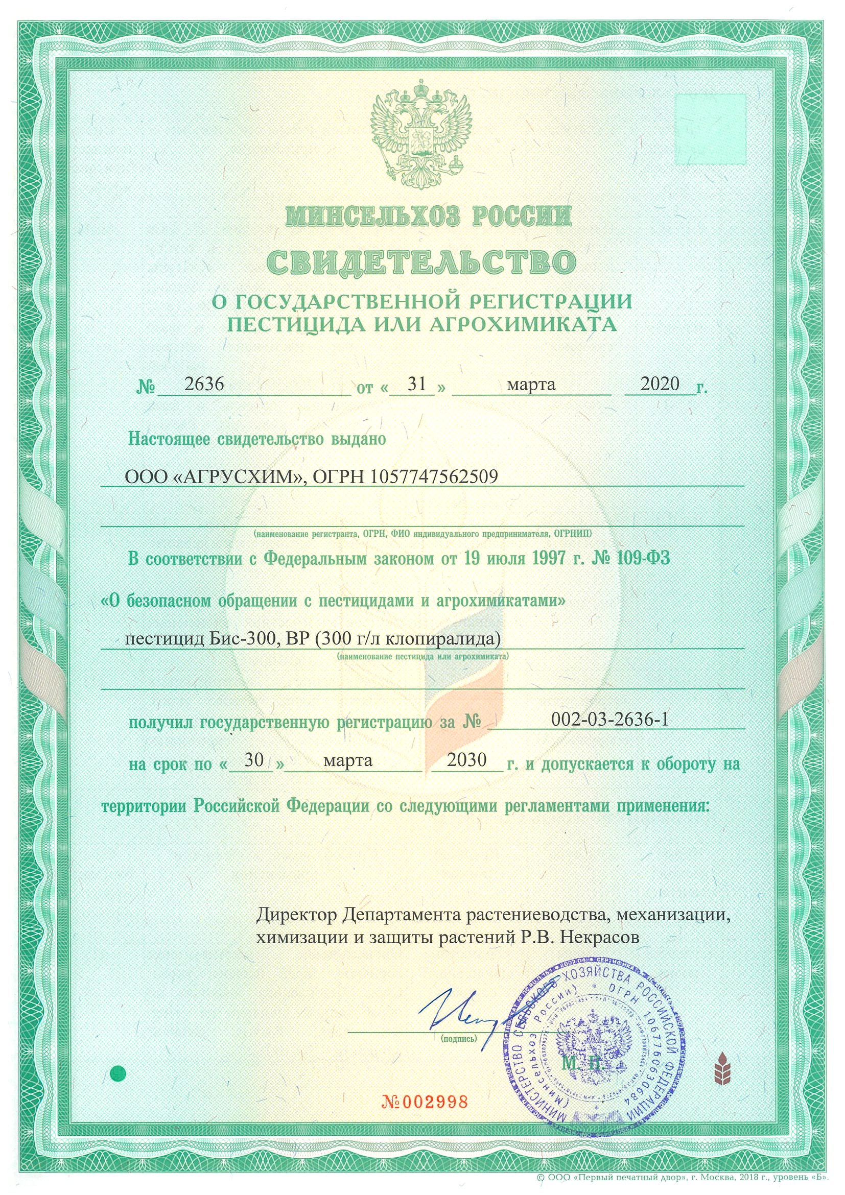 осударственная регистрация №002-03-2636-1 от 31.03.20 до 30.03.30 выдана МСХ РФ, Сертификация-декларация №РОСС RU Д-RU.РА01.В.25982/23 от 11.07.23 до 06.07.28 выдана Заявитель: ООО "Агрусхим-Алабуга"