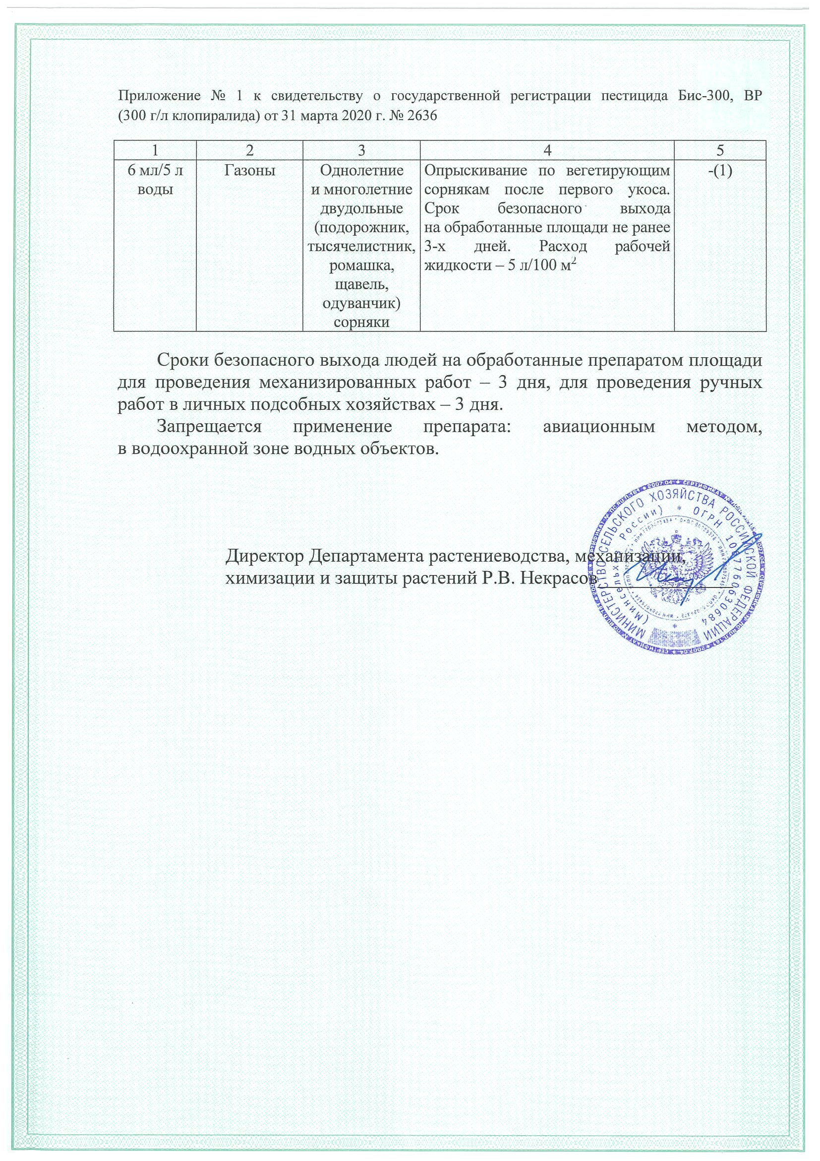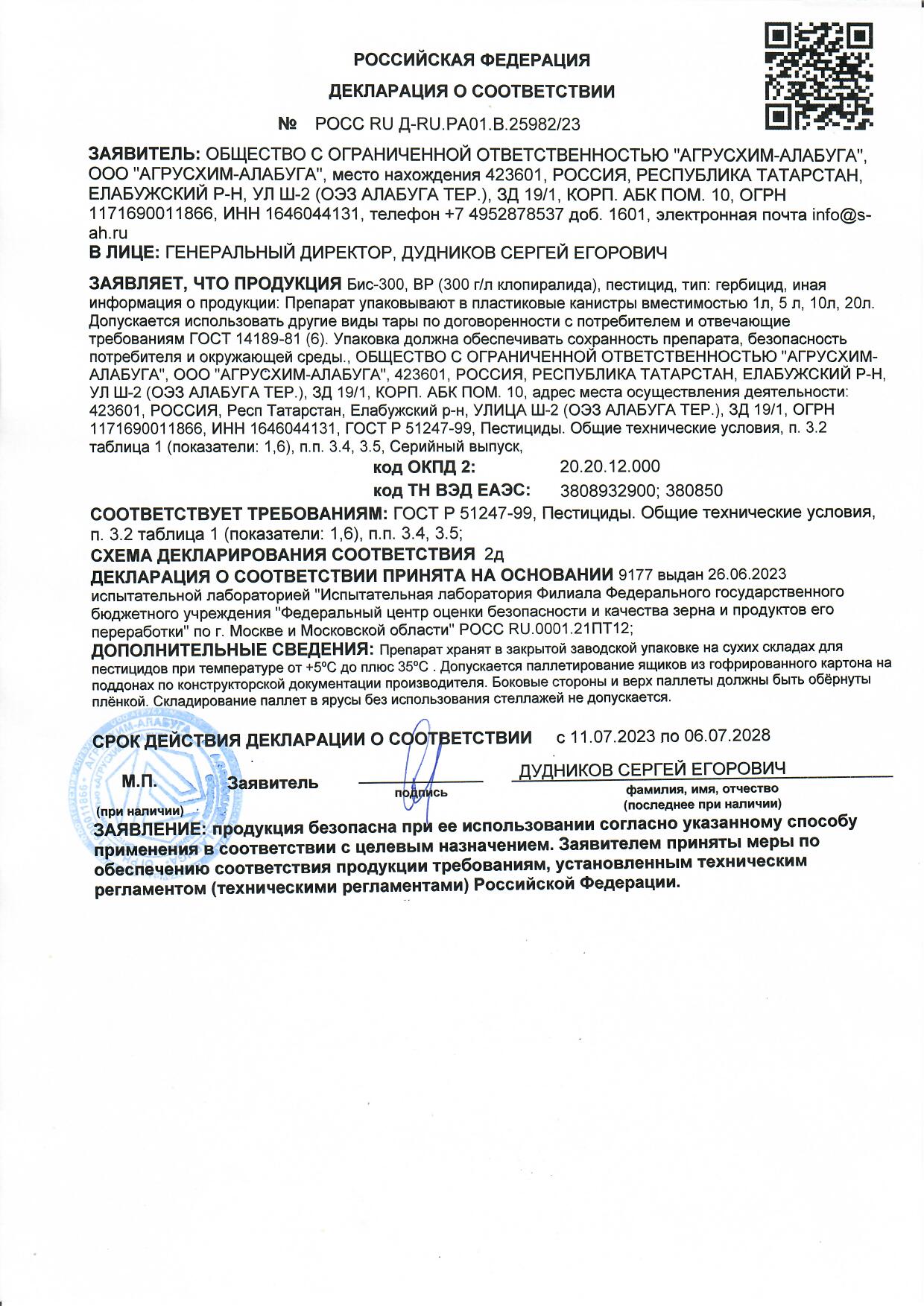 осударственная регистрация №002-03-2636-1 от 31.03.20 до 30.03.30 выдана МСХ РФ, Сертификация-декларация №РОСС RU Д-RU.РА01.В.25982/23 от 11.07.23 до 06.07.28 выдана Заявитель: ООО "Агрусхим-Алабуга"
