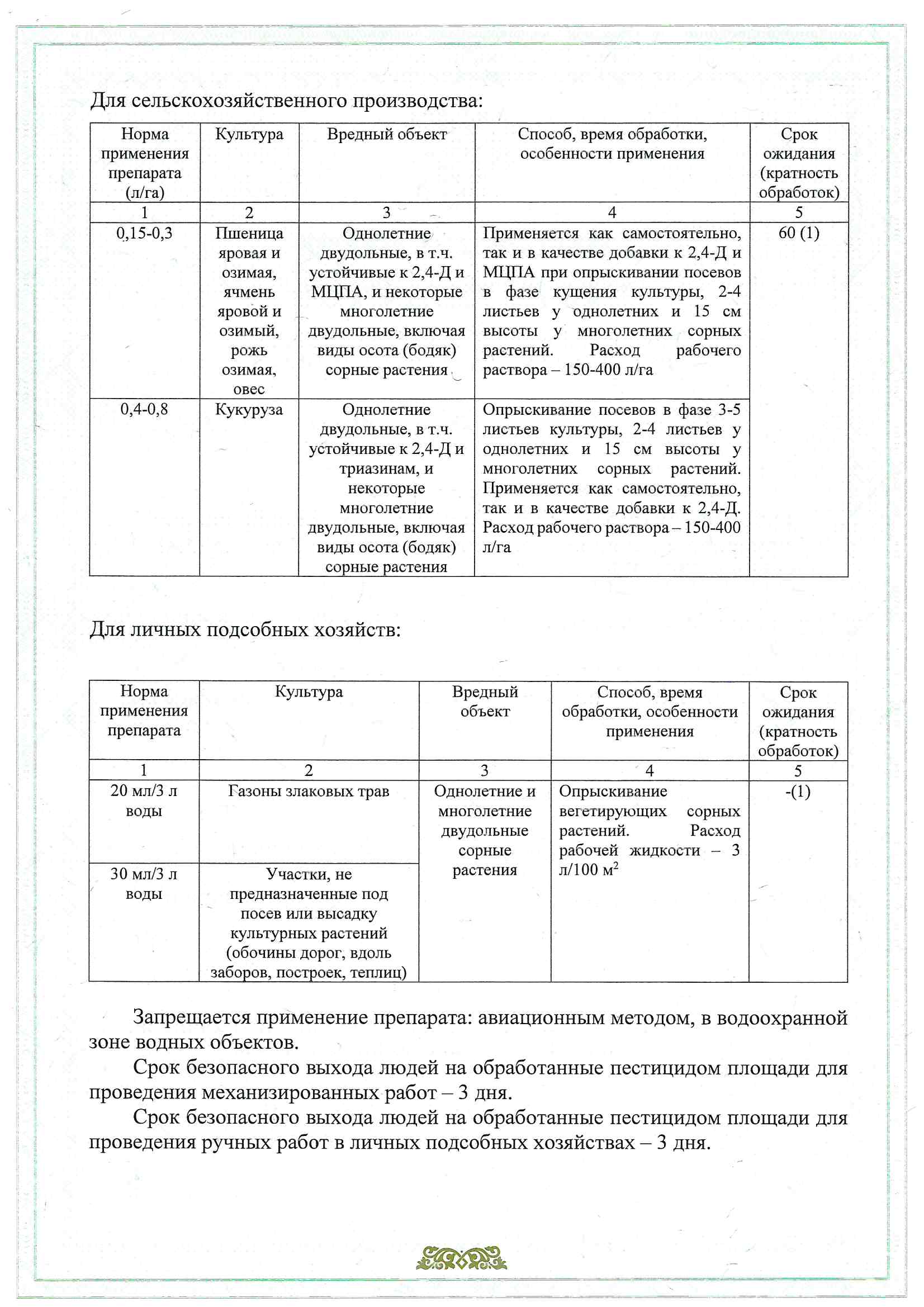 Расход раствора – 3л на 100 кв.м.Обработку проводите в сухую безветренную погоду.После обработки действие препарата проявляется через 2-3 часа.В течении 5-7 дней не удаляйте сорняки механически.Полностью сорняки отмирают через 2 недели.