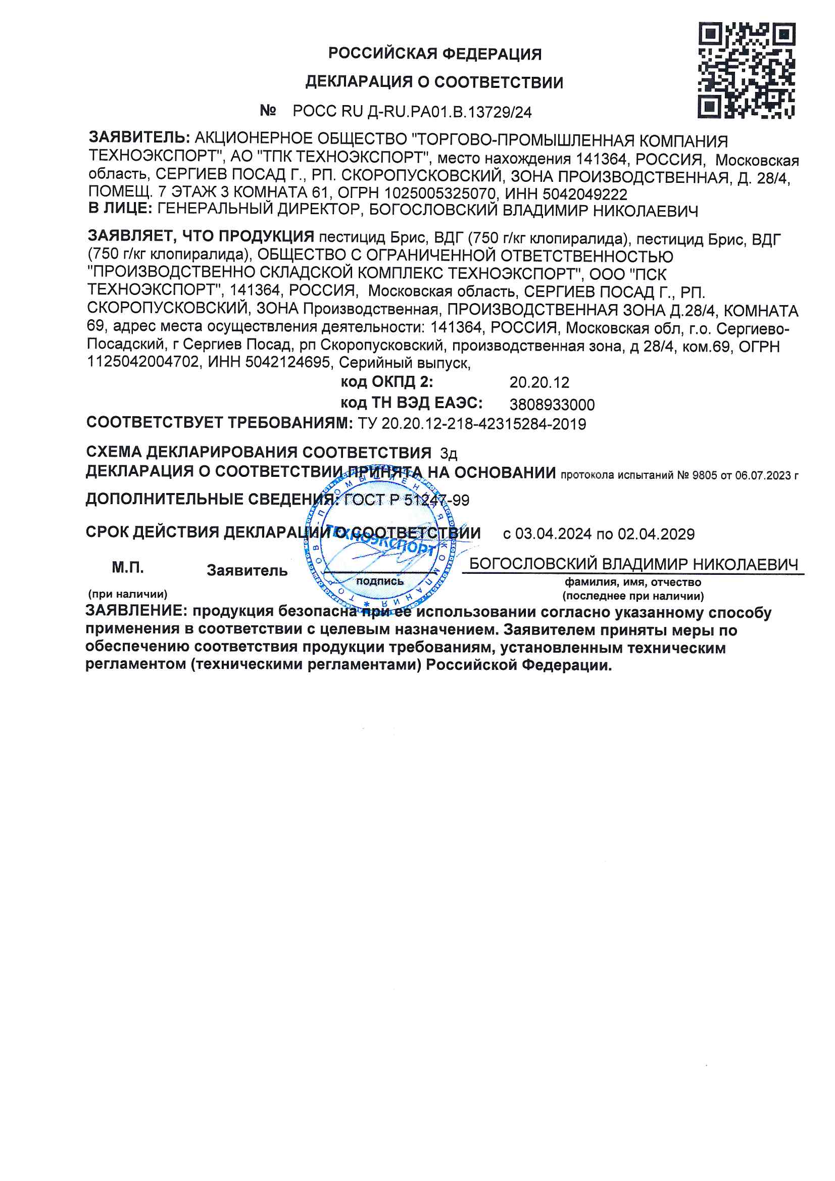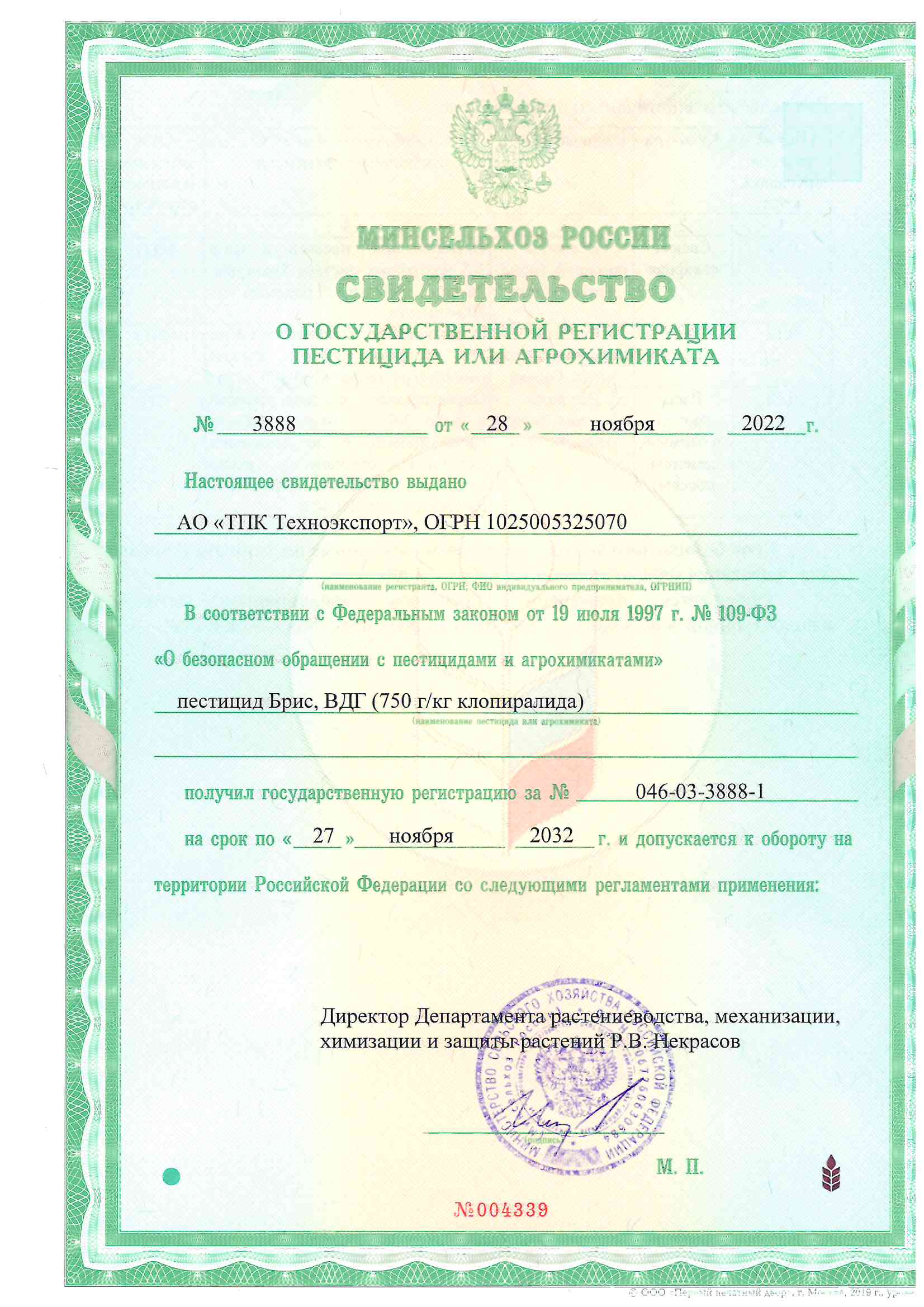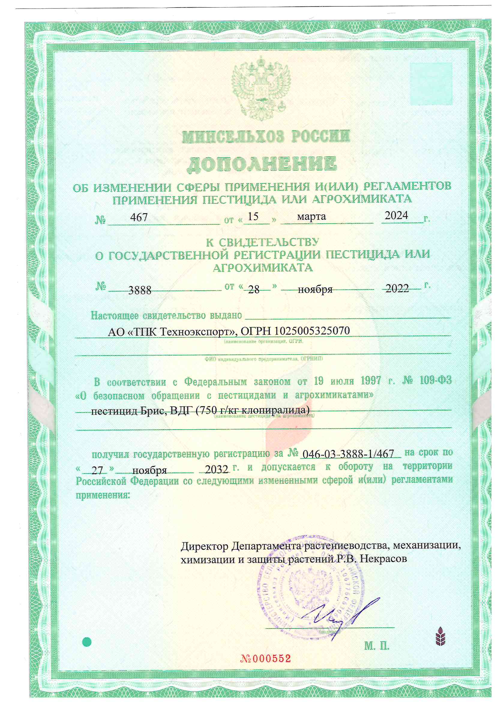 Государственная регистрация №046-03-3888-1 от 28.11.22 до 27.11.32 выдана МСХ РФ, Сертификация-декларация №РОСС RU Д-RU,РА01.В.13723/24 от 03.04.24 до 02.04.29 выдана Заявитель: АО "ТПК"Техноэкспорт"